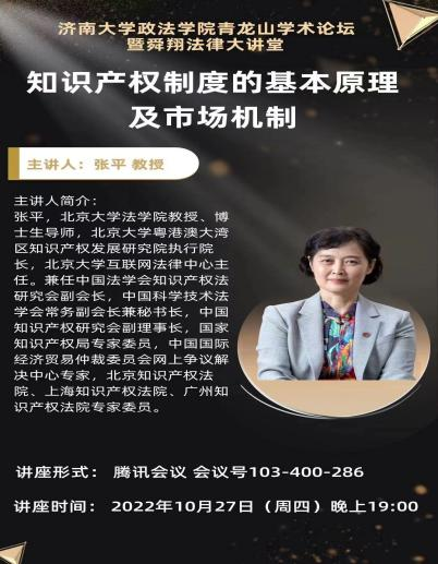 青龙山学术论坛暨舜翔法律大讲堂于线上举办,此次讲座特别邀请北京大学法学院教授、博士生导师张平教授做题为《知识产权制度的基本原理及市场机制》的学术报告。讲座由绅士漫画