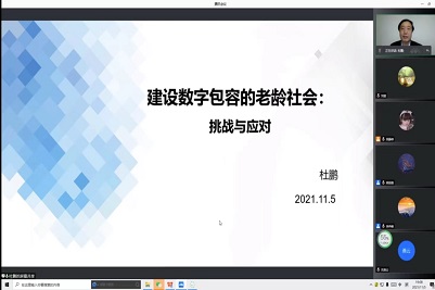 杜鹏教授分别从为什么要建设数字包容的老龄社会、数字包容面临的挑战、数字包容老龄社会的建设、建设数字包容老龄社会的意义四个方面对《建设数字包容的老龄社会:挑战与应对》这一课题展开分析。杜教授首先对数字包容社会进行了解释,并从三个方面进行讲解。随后,杜教授指出当前互联网时代老年人生活所面临的挑战,并从主观和客观角度对原因进行分析,指出构建包容性的互联网环境和数字生活应从加强老龄社会治理高度统筹解决。最后,杜教授指出建设数字包容社会有利于推动全面实现可持续发展目标,助力开发老龄经济新潜力,为老年人赋能,增加老年人福祉,建设数字包容社会同时也是实现积极老龄化的重要路径。