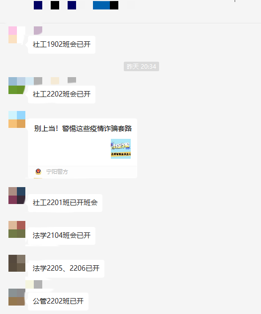 于11月26和27日两日组织院系全体辅导员和班主任开展“共同抗疫 守护家园”防疫主题班会。各年级辅导员和各班班主任聚焦疫情防控和学生日常学习生活中的实际方面,围绕正确认识当前疫情防控严峻形势、遵规守纪、疫情防控应急处置措施、爱校荣校、心理健康、消防安全和电信网络诈骗预防、就寝打卡,对学生进行教育引导,为筑牢校园疫情防控战线贡献自己的力量。
