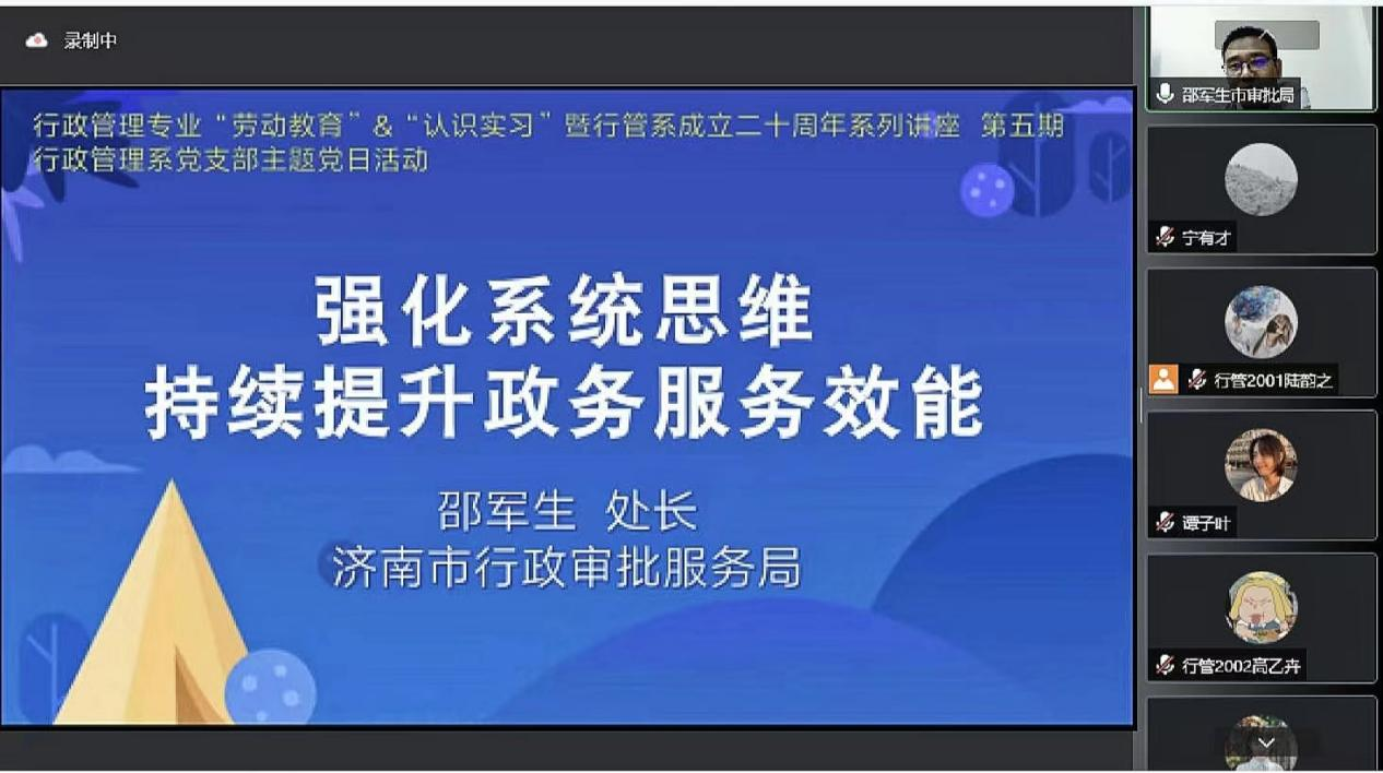 5月27日晚上,行政管理系“劳动教育”“认识实习”暨行管系成立二十周年、行管系党支部主题党日活动系列讲座第五期成功举行。本次讲座邀请到济南市行政审批服务局邵军生处长做《强化系统思维,持续提升政务服务效能》的主题报告。绅士漫画