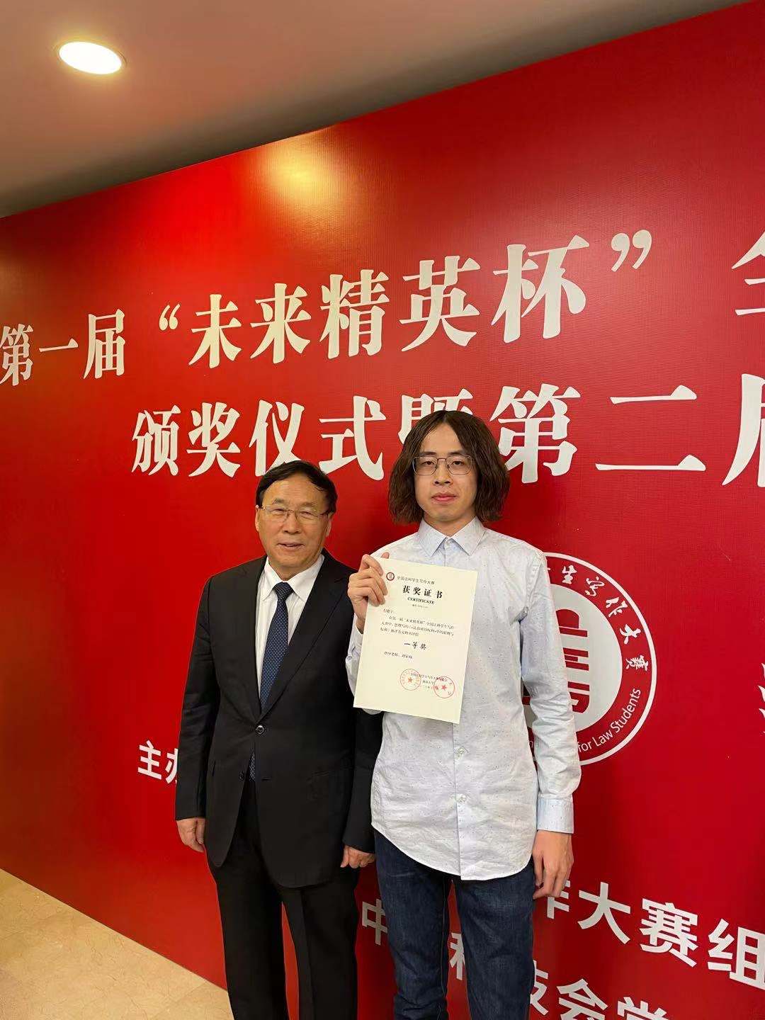 法学系刘家楠老师指导的、左晓宇同学撰写的《<认真对待权利>中的原则与权利——以原则、裁量权及唯一正解理论引发的论辩为中心》一文获得人物书评组“一等奖”。韩大元教授为获得该组一等奖的同学颁发奖状并合影留念。张文显教授向获得一等奖的同学赠送了自己新出版的专著并签名寄语。大赛主办方还向获奖同学赠送了珍藏版《漫画民法典》。