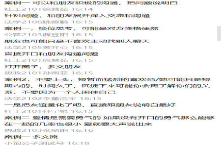 活动全程既符合疫情常态化管理的要求,又通过案例分析的形式为同学们排忧解难。活动的开展让同学们拥有一个恰当的平台,以案例为鉴,认识自己、接纳自己,体验自己存在的价值,积极调整自己的心理状态,学习切合自身的心理调适方法,为此后拥有一个积极健康的心理提供方向引导作用。同时,此次案例分析活动也极大的调动了各班心灵使者对本班心理情况的关注度和责任感,有利于为同学们的心理健康提供更多的帮助。心理健康问题越来越重要,让我们共同守护自己的心理防线,让心理健康意识入脑、入心、入行。不负韶华,不负时代!