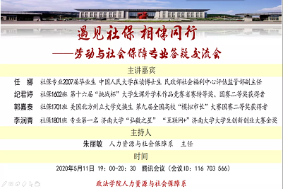 人力资源与社会保障系“遇见社保,相伴同行”劳动与社会保障专业答疑交流会在腾讯会议“云”进行。社保专业2007届毕业生任娜、2018届毕业生杨冠华,社保专业在读本科生1602班纪君婷、1701班郭嘉泰、1801班李润青应邀出席交流会,交流会由人力资源与社会保障系主任朱丽敏老师主持,2019级近百名公共管理大类学生和部分人社系教师参加交流会。