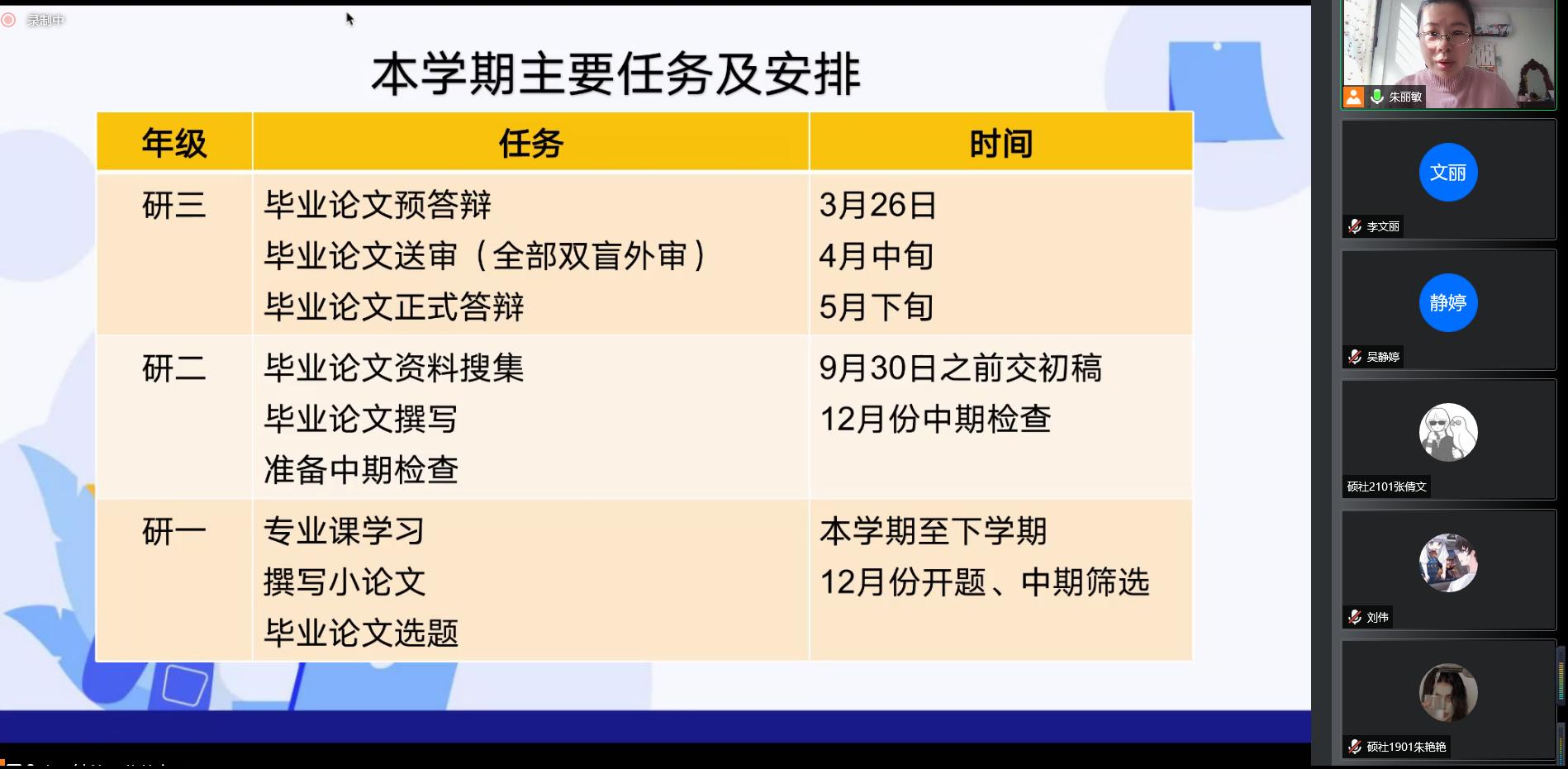 随后,院长助理朱丽敏老师结合研究生学习进程介绍了本学期的主要任务及时间安排,针对各年级分别重点强调了专业课学习和毕业论文准备、毕业论文撰写、毕业论文答辩等事宜。希望大家新学期能够继续秉承“勤奋、严谨、团结、创新”的优良校风学风,珍惜宝贵时间,再接再厉取得更大进步。