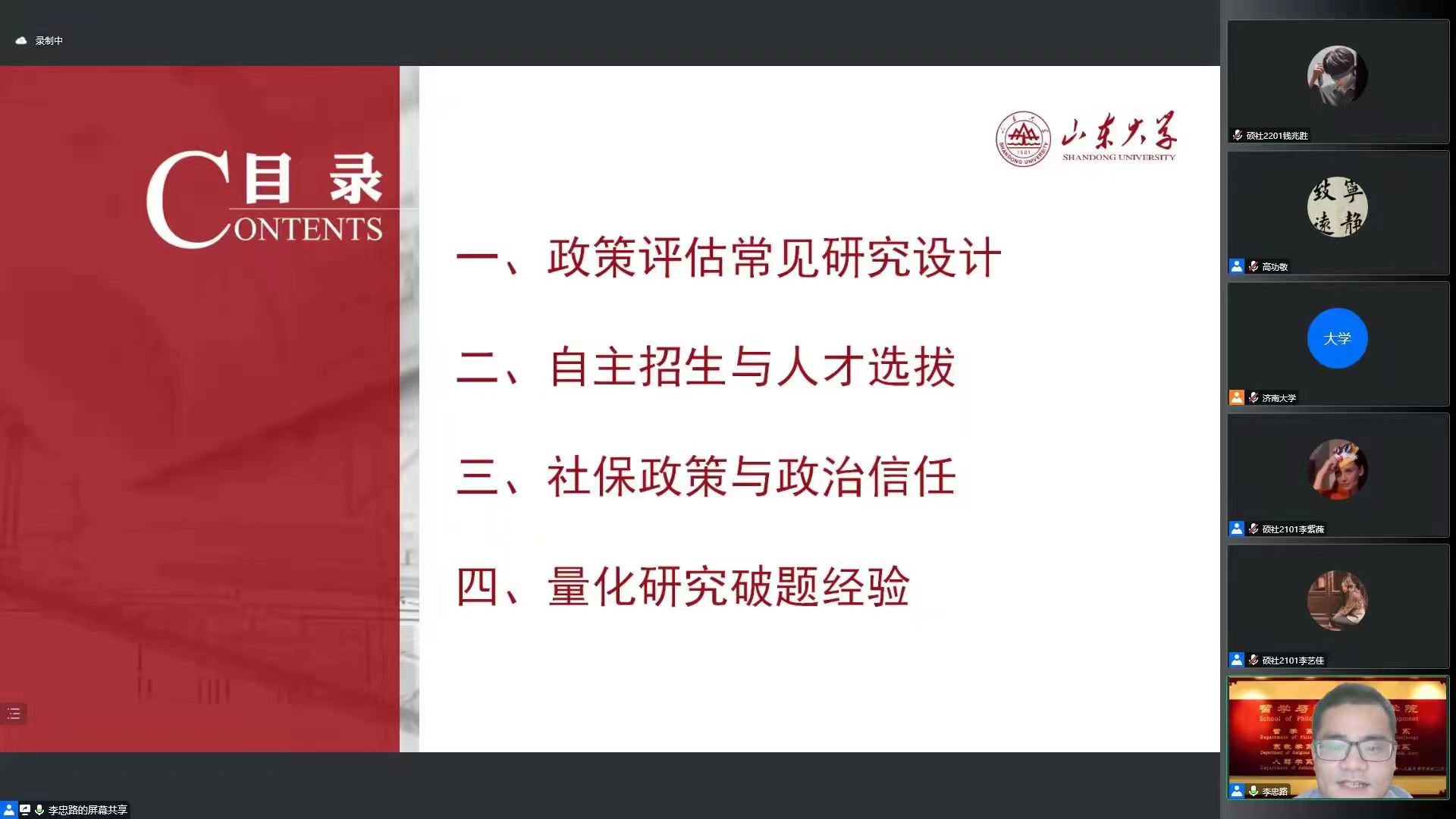 青龙山学术论坛于腾讯会议线上平台成功举办,邀请山东大学哲学与社会发展学院李忠路教授作题为《政策评估中的研究设计与实例》的学术报告,报告由院长高功敬教授主持,学院教师及研究生、本科生共120余人线上参加。