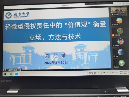 法学学术系列讲座于3月31日成功举办,此次讲座邀请了烟台大学法学院刘经靖教授线上作了《轻微型侵权责任中的“价值观”衡量:立场、方法与技术》的报告。学院党委书记徐庆国、院长助理李秀凤副教授、法学系主任袁曙光教授、学院部分教师及全体法律硕士研究生90余人参加了讲座,讲座由刘康磊副教授主持。