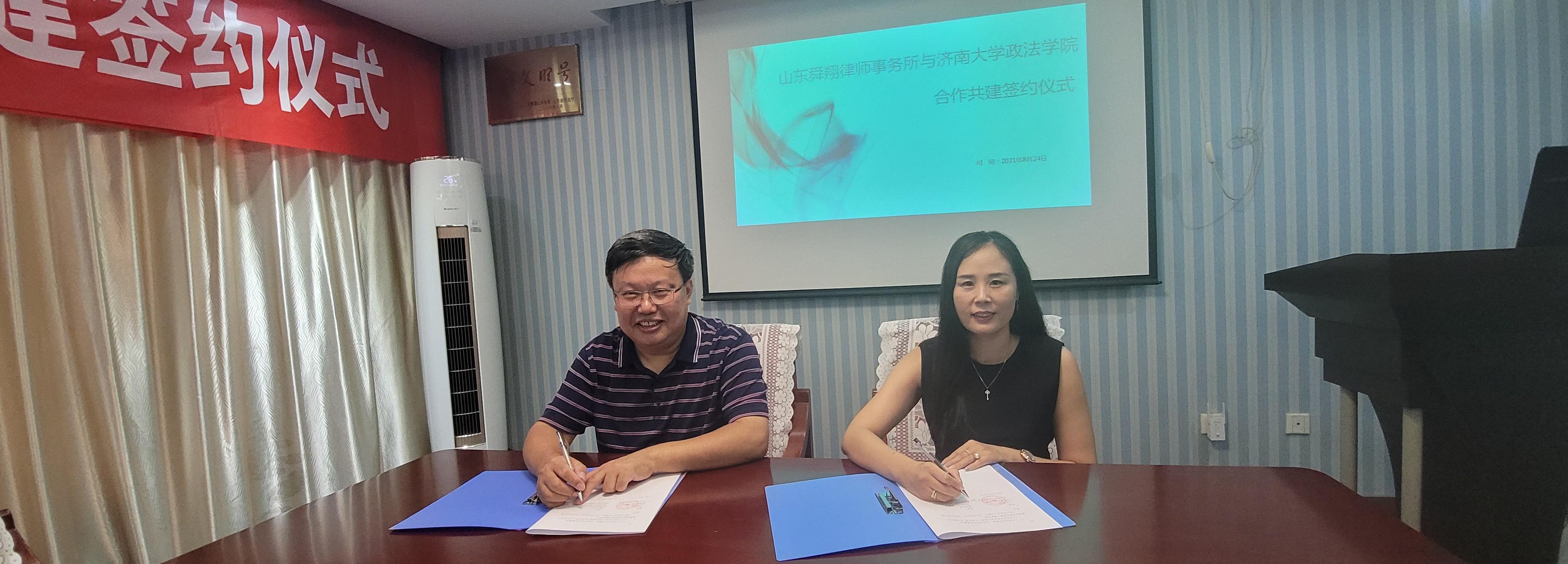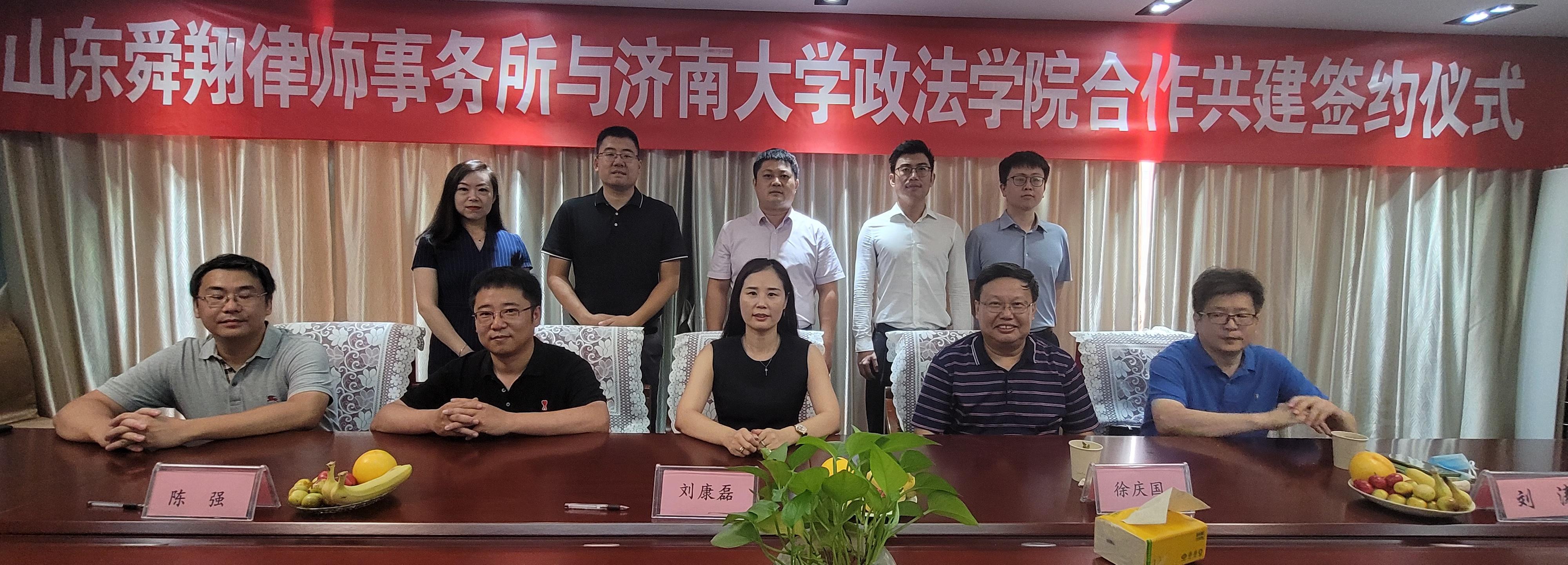 与山东舜翔律师事务所合作共建签约仪式在舜翔律所举行。学院党委书记徐庆国、副院长刘康磊、学院培训办公室主任刘涛、法律硕士中心主任陈强、法学系教师张善宝与舜翔律所主任齐姣、律所金融保险部部长李洪持、政府顾问部部长魏玉磊、公司风险防控部部长燕丽等出席签约仪式。