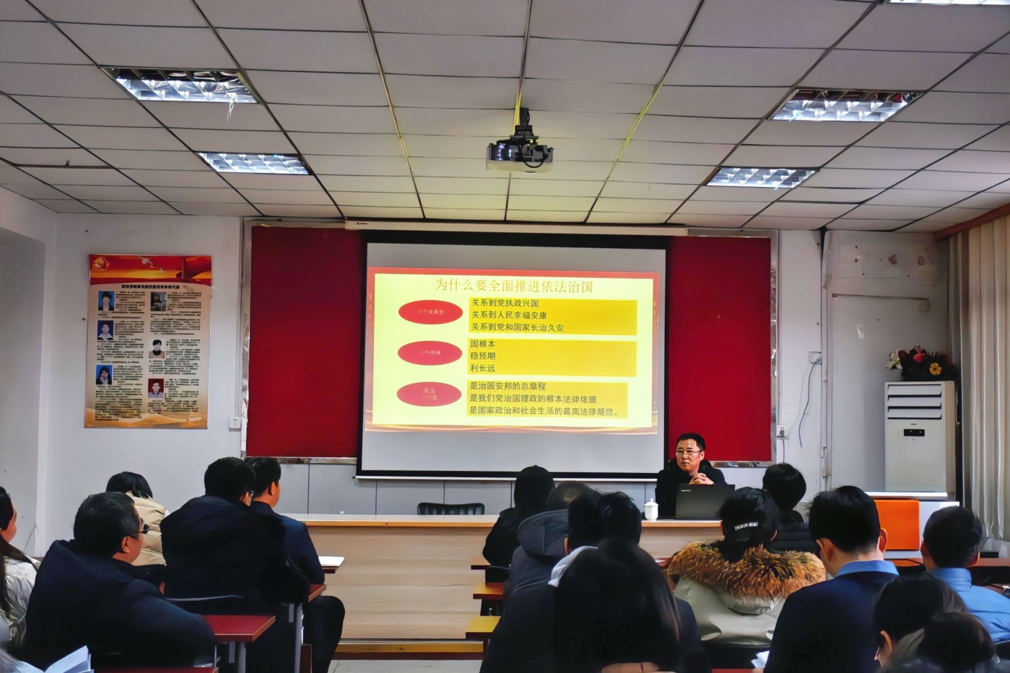 会上,李春慧领学了习近平总书记在主持中共中央政治局第十次集体学习时的重要讲话精神。法学系系主任刘康磊教授作题为《贯彻落实习近平法治思想 以法治方式推进多层次治理的中国式现代化》的辅导报告。