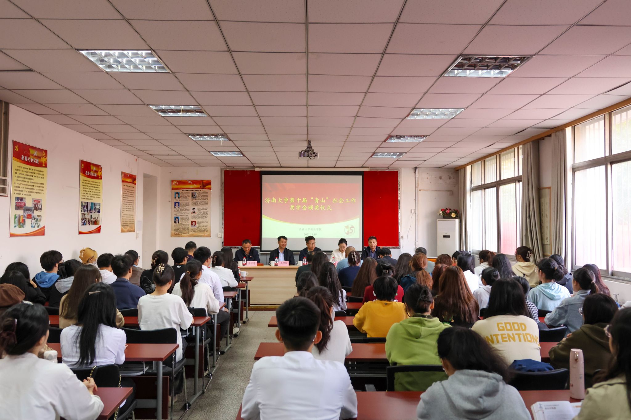 第十届“青山”社会工作奖学金表彰决定。学院领导及与会嘉宾为第十届“青山”社会工作奖学金获得者安晓雨、张梓彤、雷宇、宋呅咛、廖诗榕、王月、全镜衡、何小瑶、王安旭、杨斯淇同学颁奖。