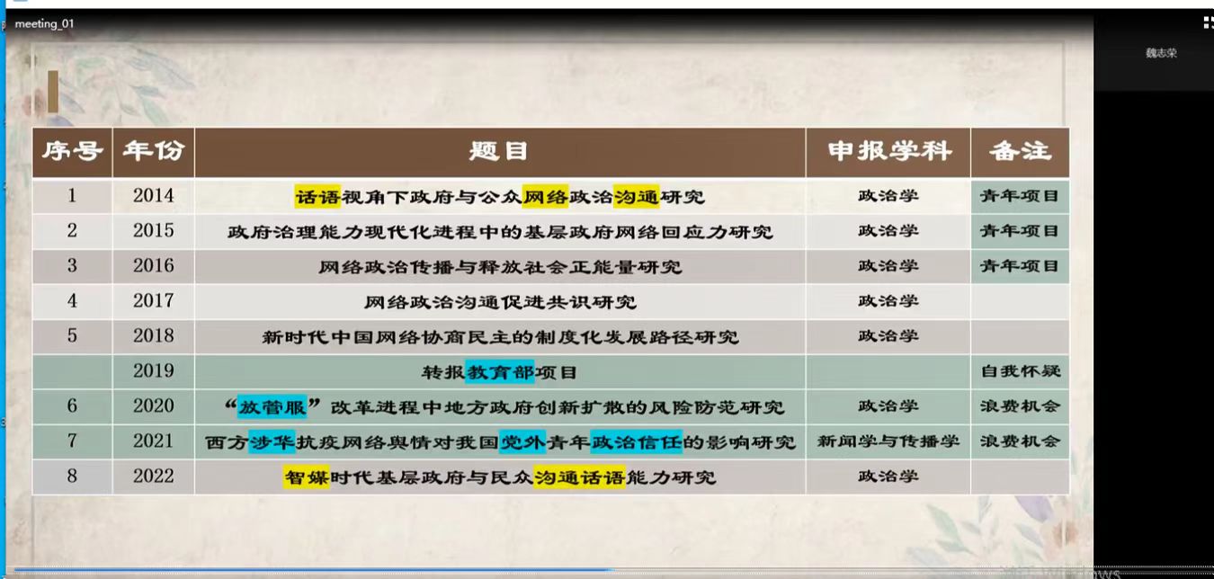 随后,2022成功立项的郝丽教授、魏志荣博士、刘雨辰副教授以及2019年立项的齐晓霞教授结合自己的申报经历就心得体会和成功经验进行了精彩分享。郝丽教授从研究选题、研究内容、研究成果三个方面进行了详细介绍,重点强调了“坚持”的重要性。魏志荣博士根据自己“坚持,自我怀疑,再到回归”的八年申报心路历程,重点分享了失败的教训和成功的经验。刘雨辰副教授以“从漂浮到落地”为题,从评估博士论文的硬件要素、预热申报心理、努力激活博士论文的学术思维三个方面分享了国家社科基金后期资助项目申报的心得体会。齐晓霞教授重点强调选题要新颖,要注重专家意见,以及与专家和同事间的内部讨论对于开拓研究思路、完善申报书内容的重要性。