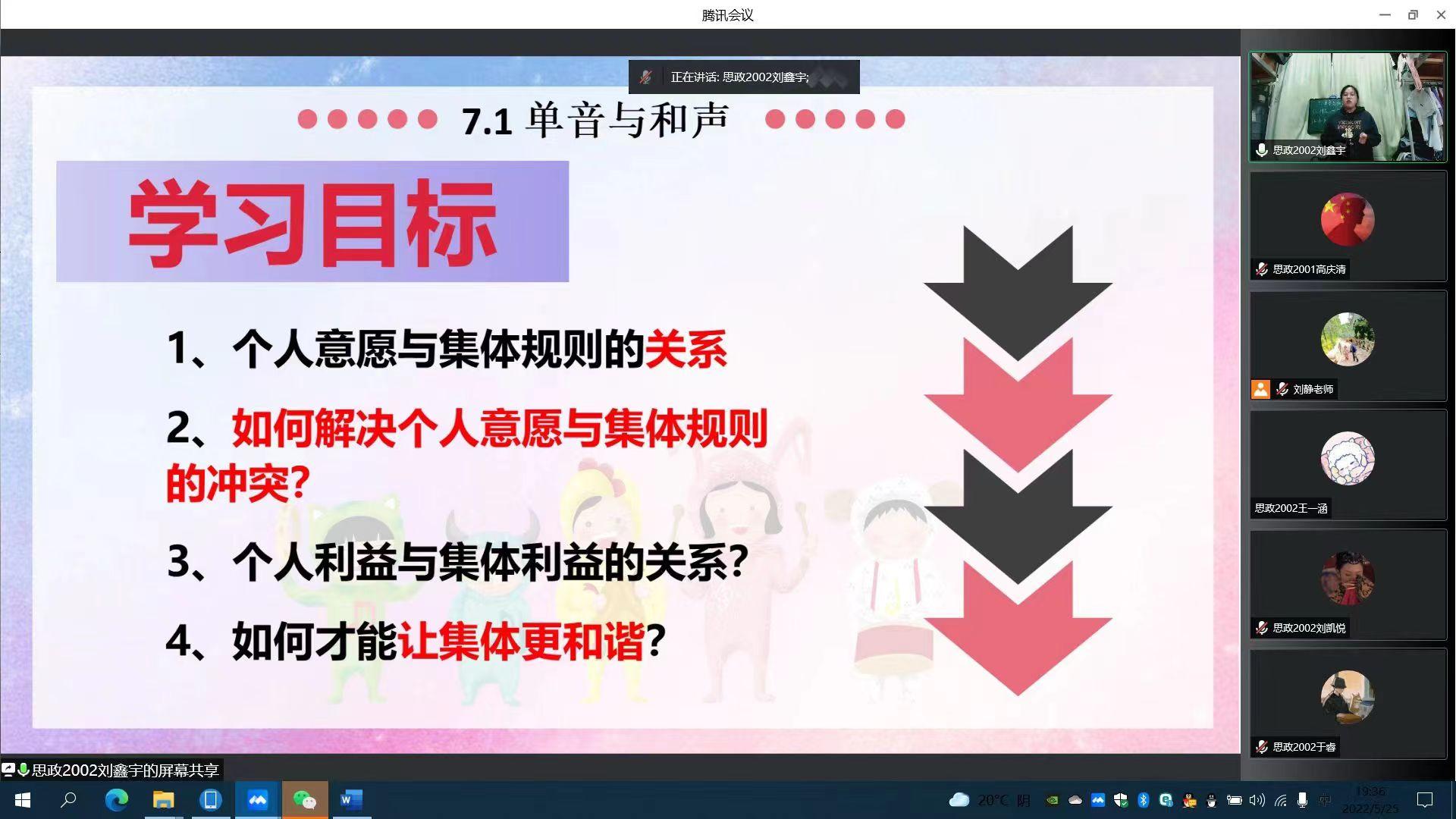 会上,思政专业20级2班学生刘鑫宇做了“单音与和声”的课堂展示,崔新喜老师结合自身经验,给予了指导建议。随后,崔老师以其精品公开课程《青春的情绪》为例,围绕“六大因素”,即确定方向,划定范围;确定好学情,对学情进行调研;抓好课程导入,注重学生亲身感受;精选课程资料,为课堂服务;发挥学生主动性,做课堂主人;补充拓展内容,让课堂更加出彩,对“如何讲好一堂课”进行了详细讲解。