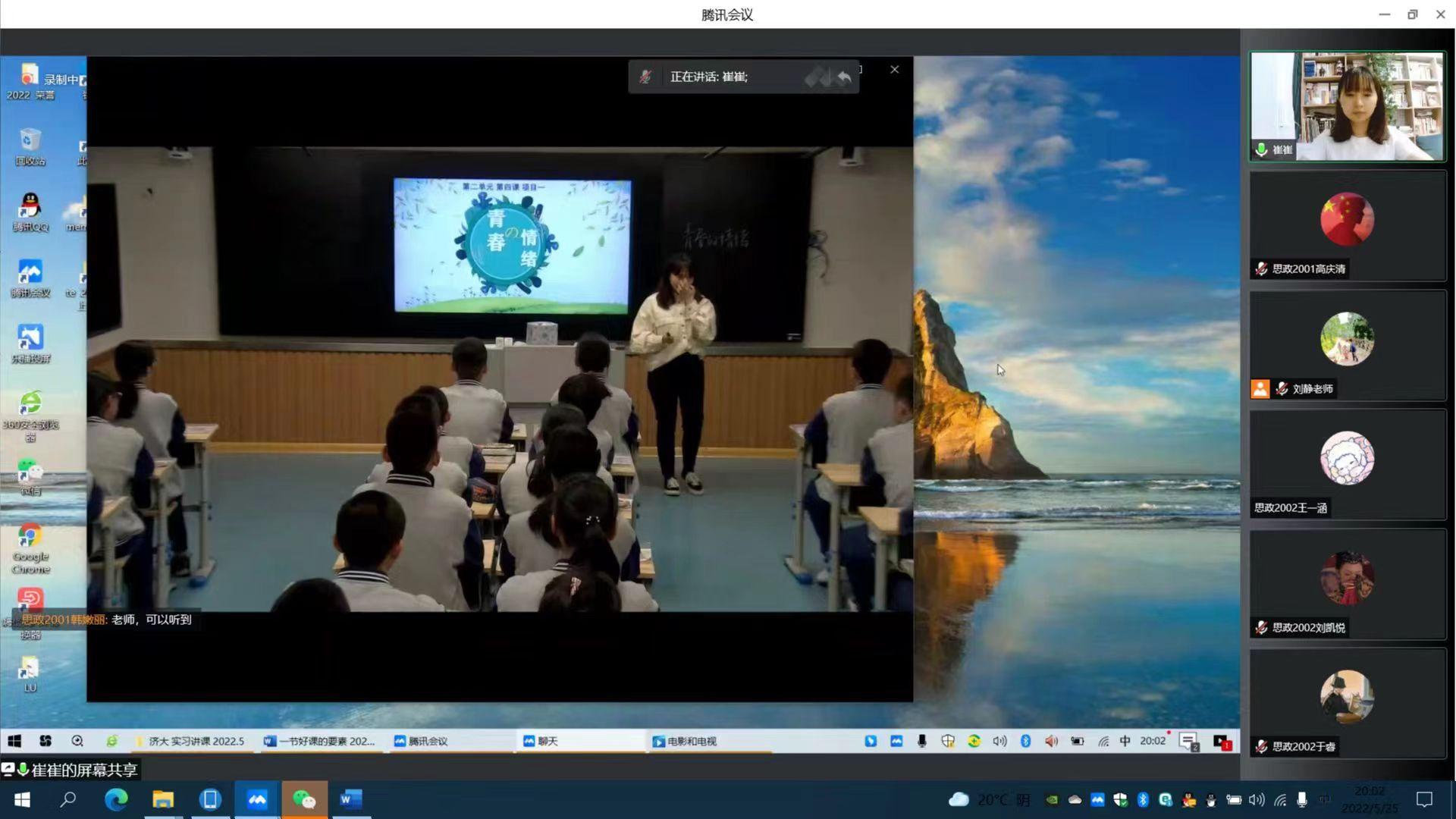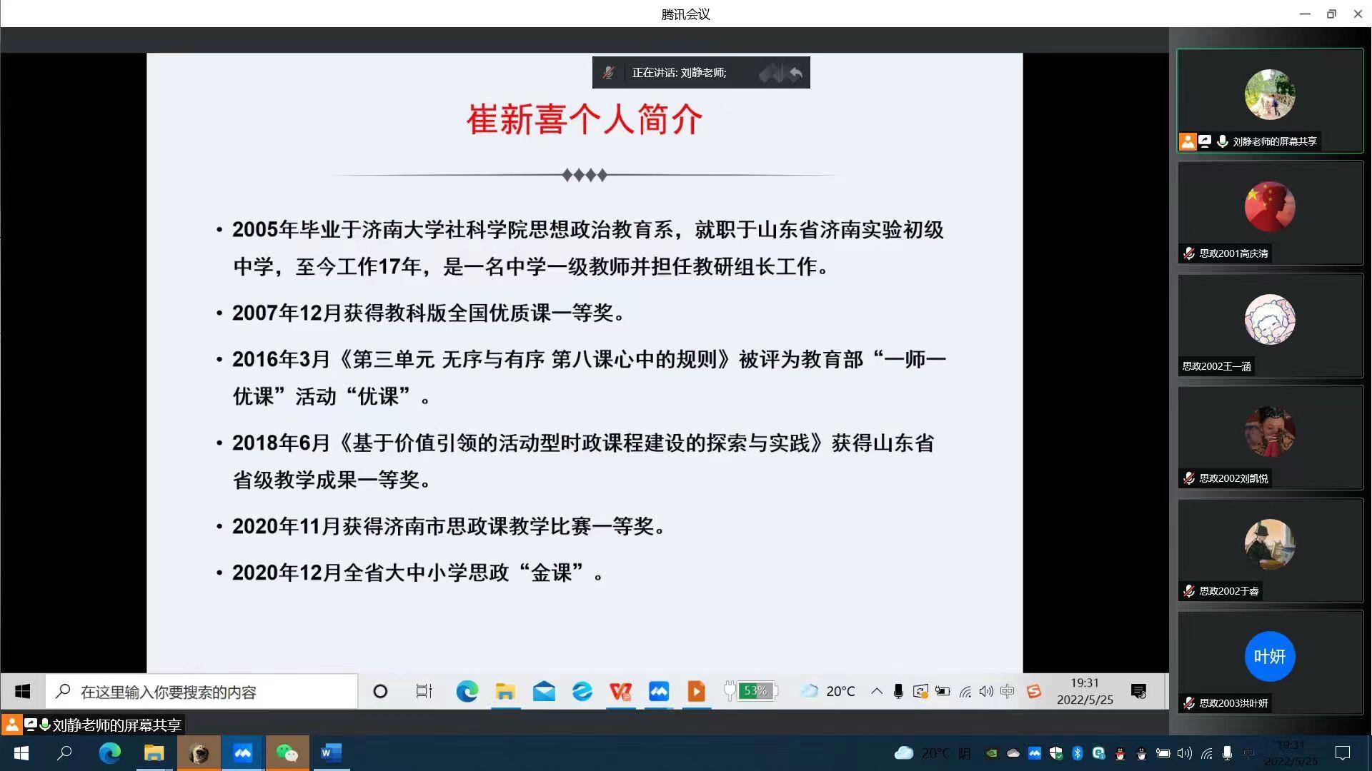 “师范生教学技能大讲堂”继续开讲,济南实验初级中学一级教师崔新喜老师应邀同思政专业2020级学生进行了教学技能的指导和分享,政治系教师刘静主持报告。