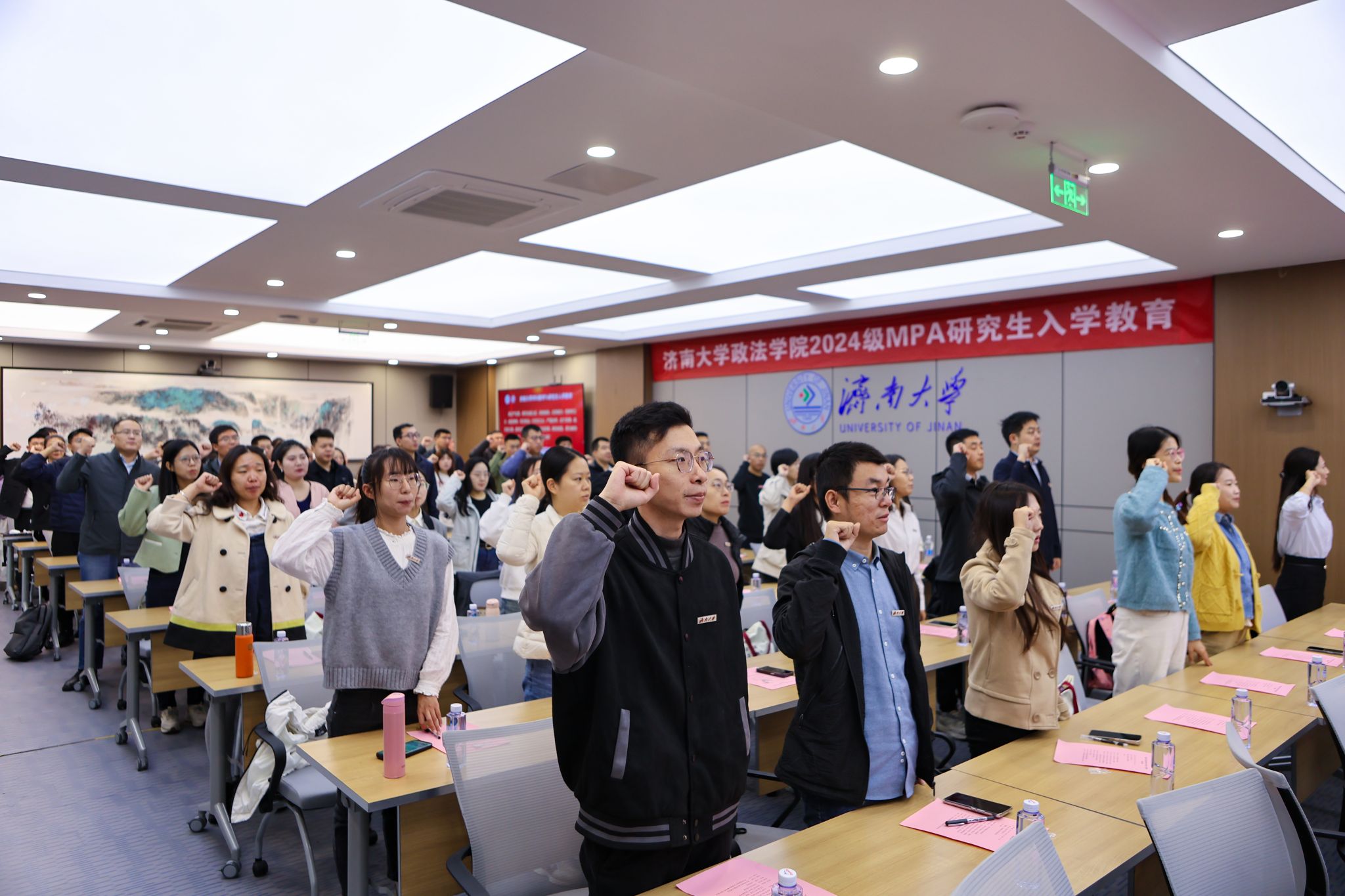 随后,在2024级MPA研究生李静雯带领下,全体新生举起右拳,铿锵有力的郑重宣读研究生“新生誓词”,用宣誓许下对未来的承诺。