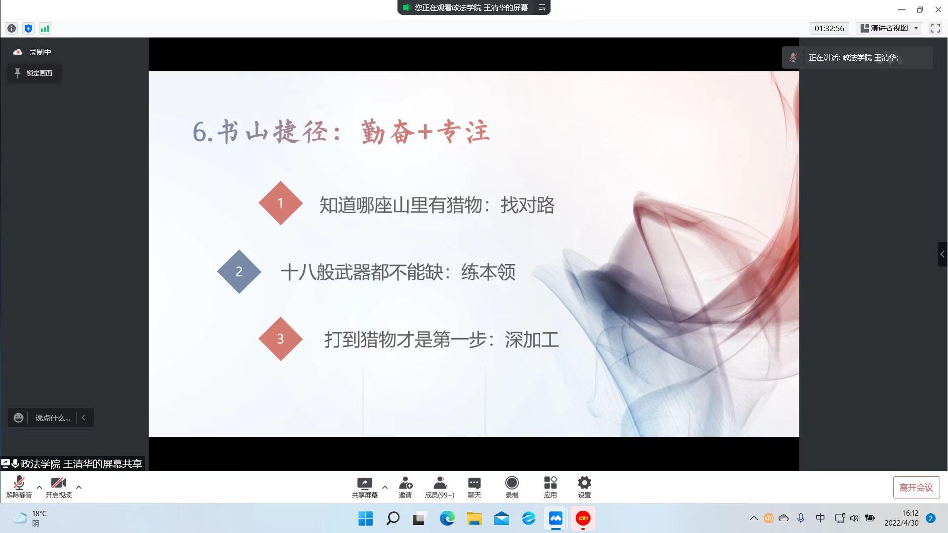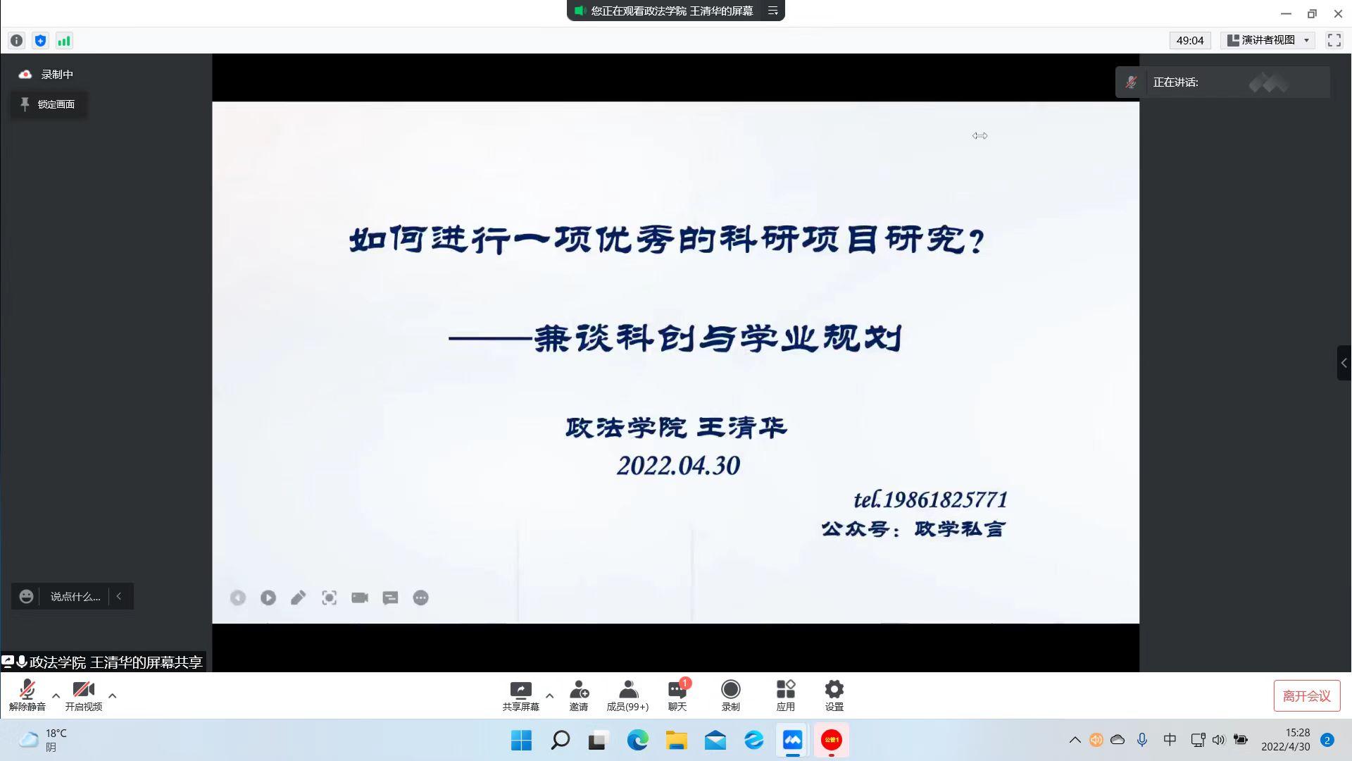 第一个环节,朱赫同学以“优秀团队是如何炼成的”为主题进行分享。他强调参与科创赛事要坚守纯洁的初心,少一份功利,多一份热爱,从践行课堂所学的专业知识,对感兴趣的社会热点问题的实践出发,去参与科创赛事。他提出奉献精神和团队精神是一个优秀团队的必备精神,是一个团队行稳致远的加油剂。不断学习、终身学习的能力也很重要,团队中的同学们拥有着不同的专业背景,但成员们应该不断学习更多的知识,为团队更好地奉献力量,“在集体中奉献自我,在团队中相互成就。”朱赫同学还分享了大量“独家”参赛经验,给在场同学们的科创思路规划提供了更多的灵感。第二环节,王清华同学现身说法,向在场学生分享了进行一项优秀的科研项目研究的过程。他指出一个优秀的科研项目应该注重科学性、创新性和现实性。其中他提到“导师+学生”的科创赛事团队形式,对学院的科创工作有着积极的启发作用。基于项目寻找队员,专业知识有互补和吃苦耐劳又激情创新是王清华同学对我们构建团队的真诚建议,他认为“勤奋+专注”才是书山捷径,也是我们参与科创赛事应有的精神。活动最后是朋辈答疑环节,由两位嘉宾针对现场同学的疑问进行了系统、耐心的回答。这些建议深化了同学们对科创赛事的了解,增强了同学们积极参与科创赛事的信心和勇气。