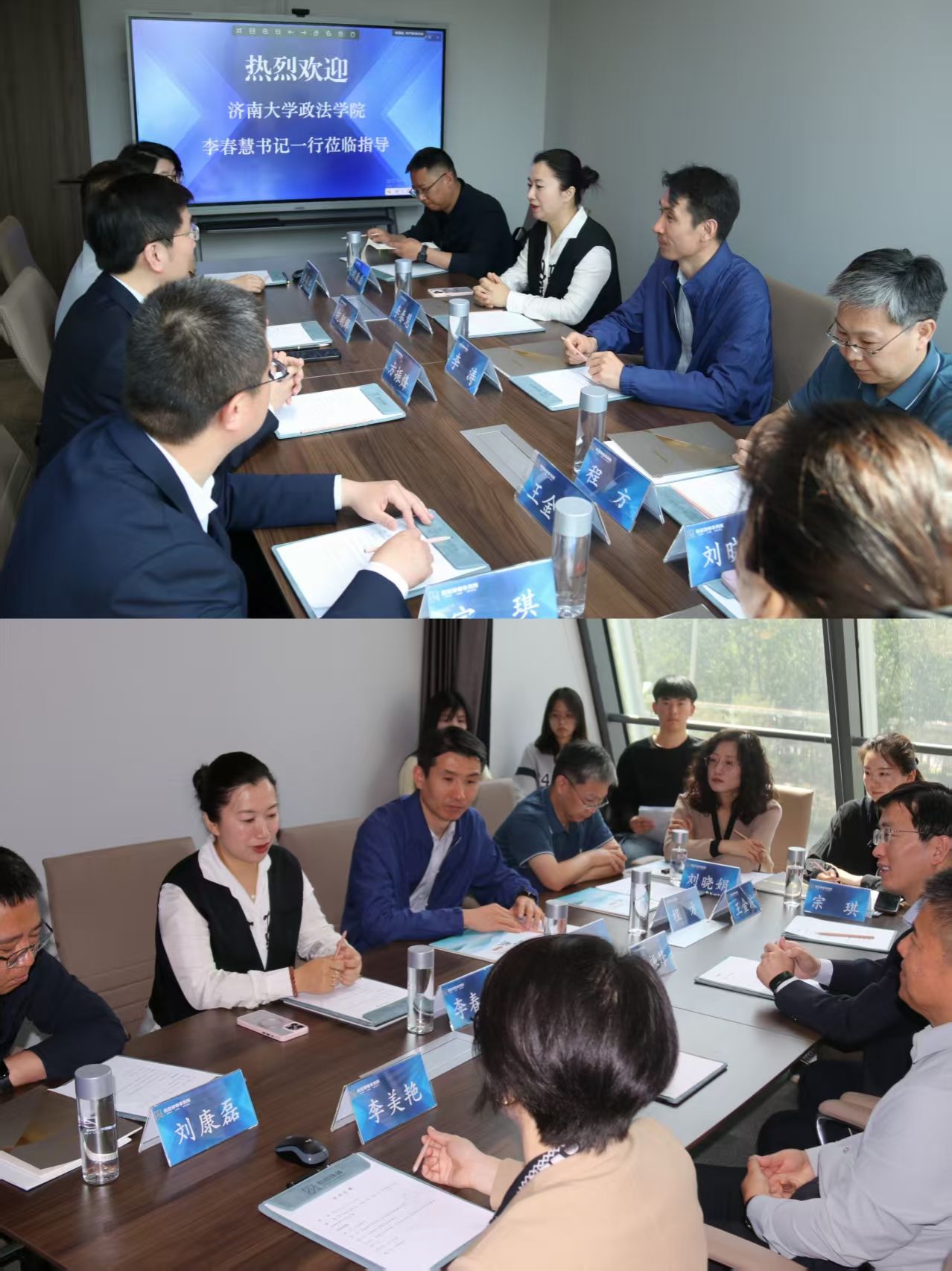 学科建设与人才培养情况。她表示,学院高度重视实践育人,希望通过与律所共建基地,推动法学教育与社会需求精准对接,为学生提供更多优质实习岗位和创新创业实践机会,全面提升学生的法律实务能力与社会竞争力。李涛就学生就业指导、实务课程共建等合作方向提出具体建议。法学系系主任刘康磊和党支部书记程方介绍了省人大地方立法研究服务基地、省司法厅政府立法研究服务基地、济南律师学院等基地建设情况,就支部共建、培训基地建设以及文化品牌合作等方面进行了深入交流。