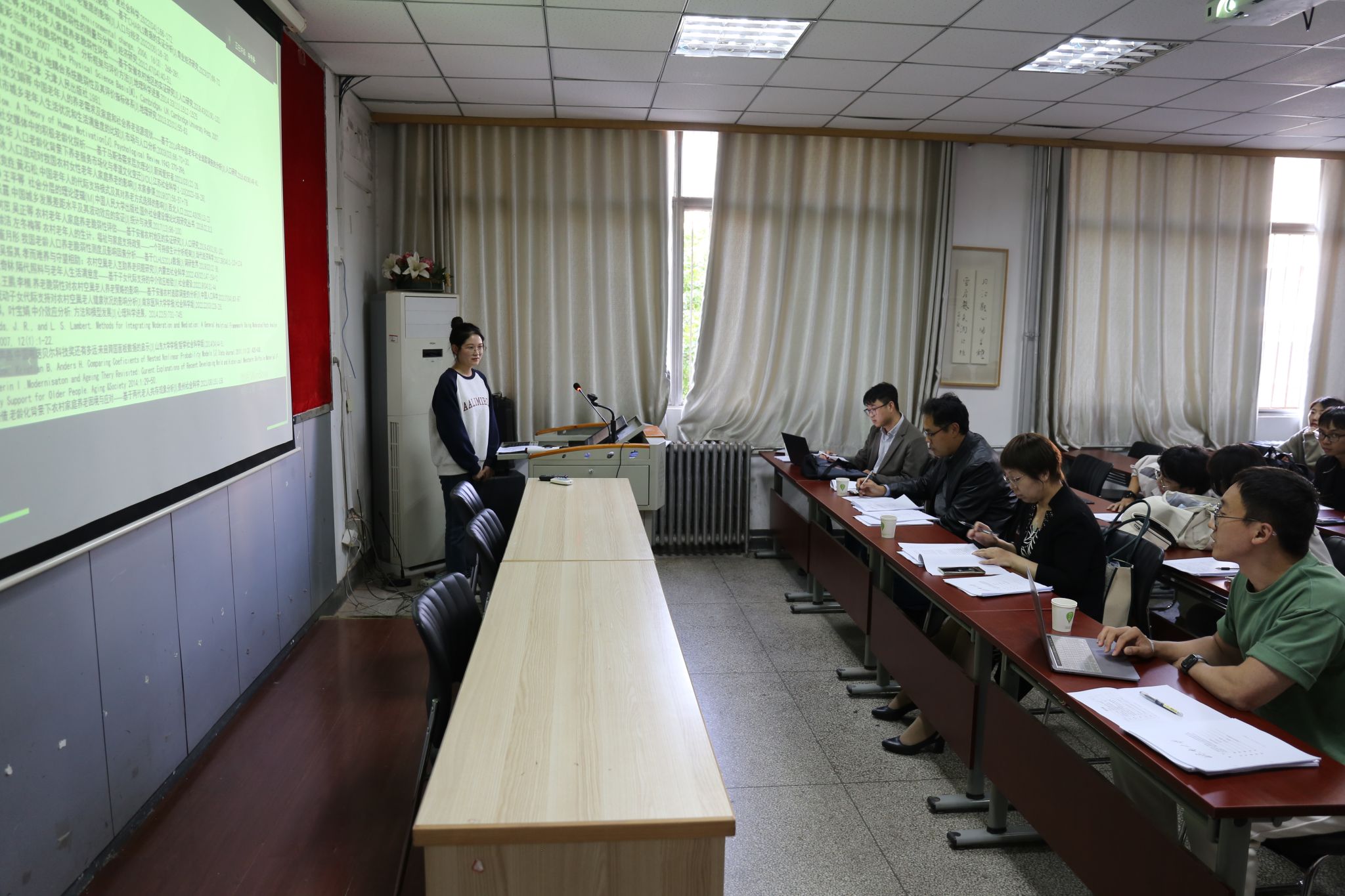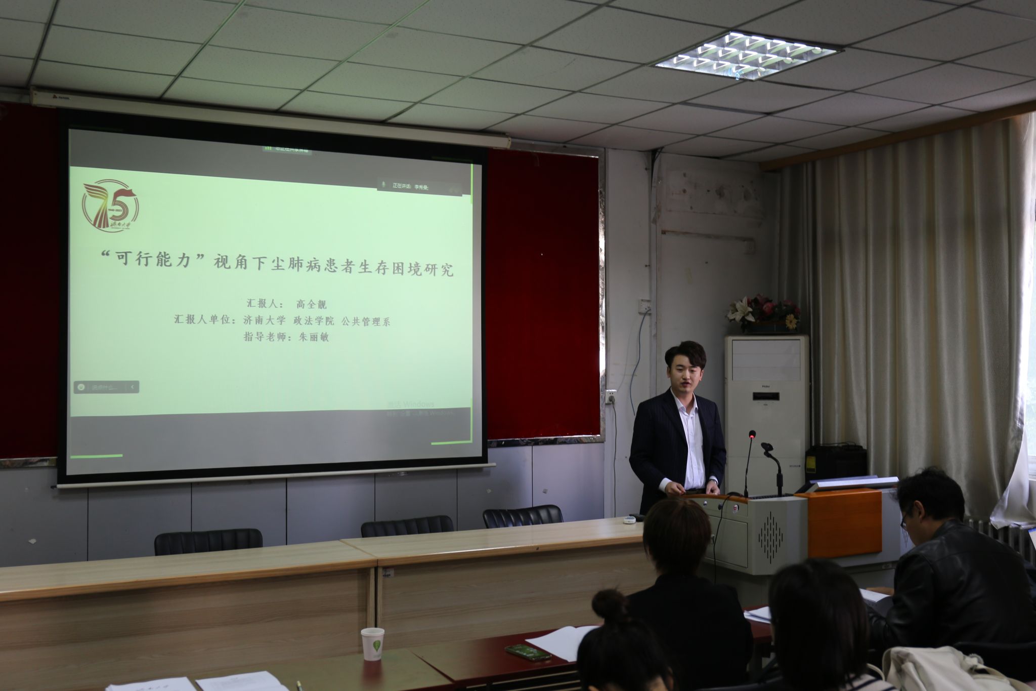 刘珂冰、高全靓、黄燕、孙治义、林益立五位同学分别就题为《“交换”与“反馈”:家庭时间禀赋代际转移对老年人养老意愿的影响—子代经济支持的中介效应》《“可行能力”视角下尘肺病患者生存困境研究—基于山东省十六地市的实地调查》《流动中的“孝道”:子女流动距离对老年人家庭养老脆弱性的影响及城乡差异—基于CLASS2018的实证分析》《阶层感知对大学生内卷的影响研究—以J高校为例》《家庭教育对性别角色观念的塑造:有调节的中介模型》的论文进行了汇报。点评嘉宾从论文选题、数据收集、理论框架、研究方法、格式排版、参考文献等方面进行了点评,并给予了完整的修改建议。针对同学们存在的问题,点评嘉宾提醒同学们注意问题阐述的准确性、数据选择的时间性、图表使用的规范性以及写作范式的严谨性等问题。