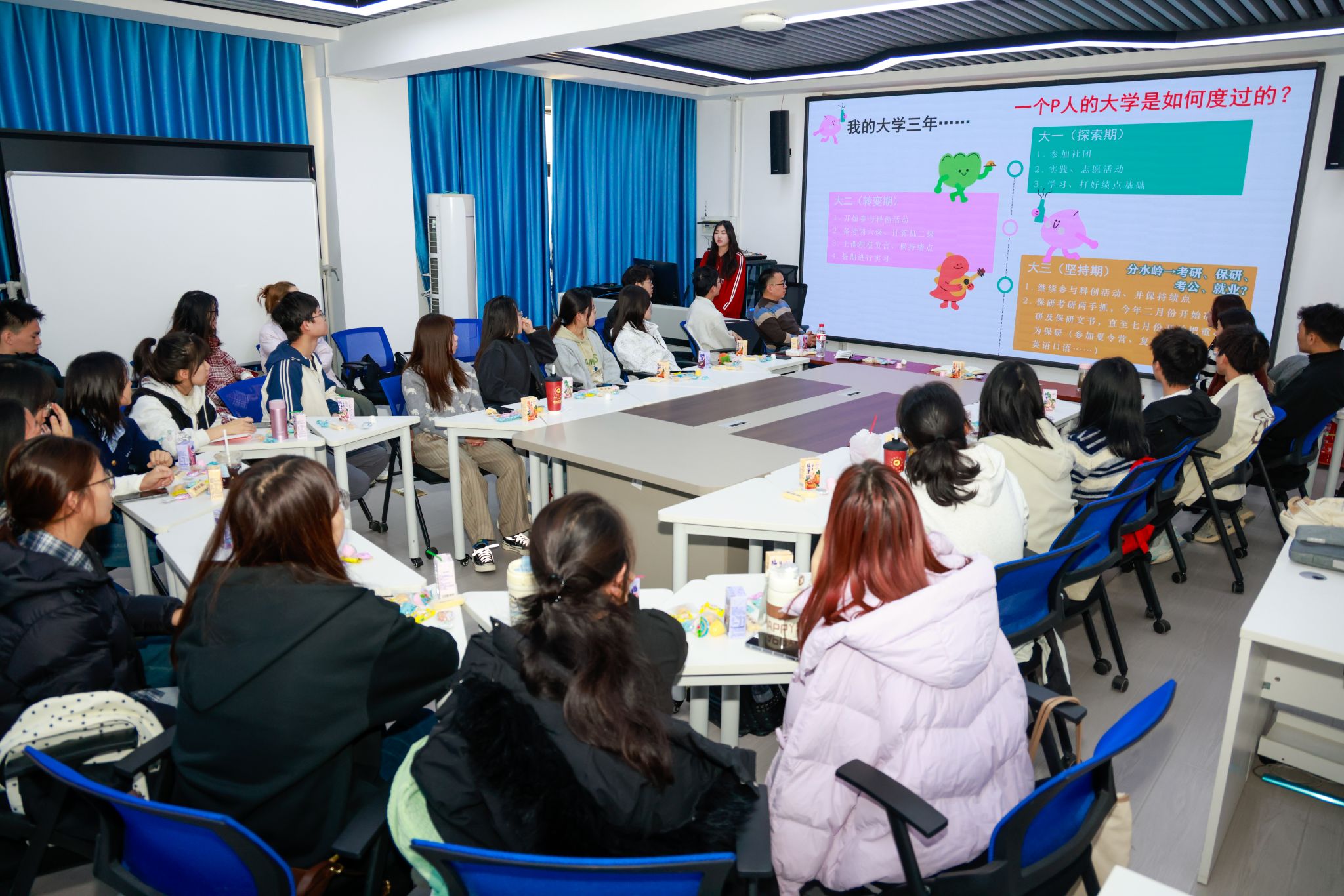 活动伊始,通过“计时传纸巾”和“动物园里有什么”两项破冰游戏,现场气氛迅速活跃起来。同学们在轻松愉悦的环境中加深了对彼此的了解,有效缓解了紧张情绪。随后,2022级的林黄冰、陈玉洁、仇悦、郑博超四位优秀学生依次进行了主题分享。