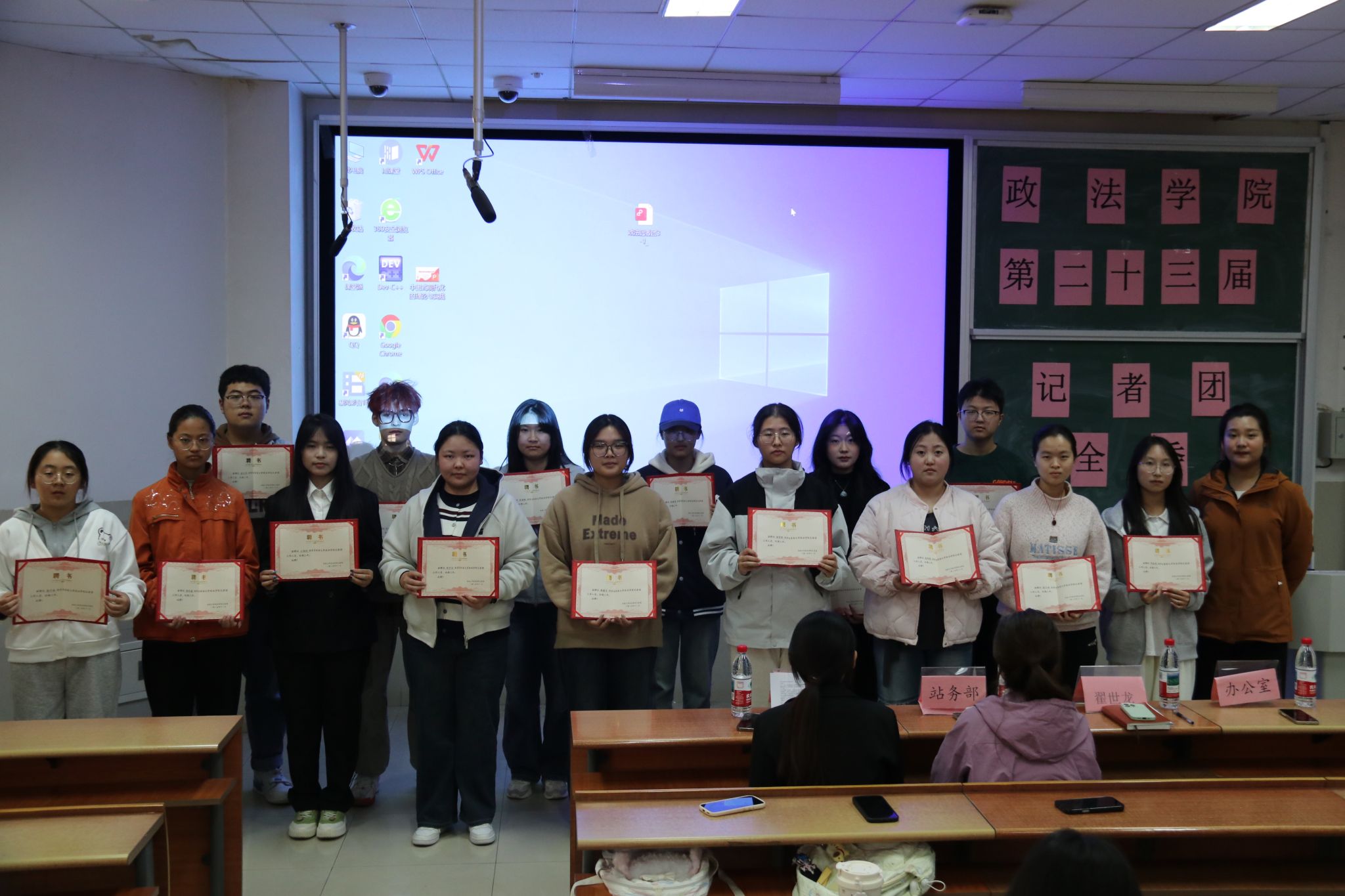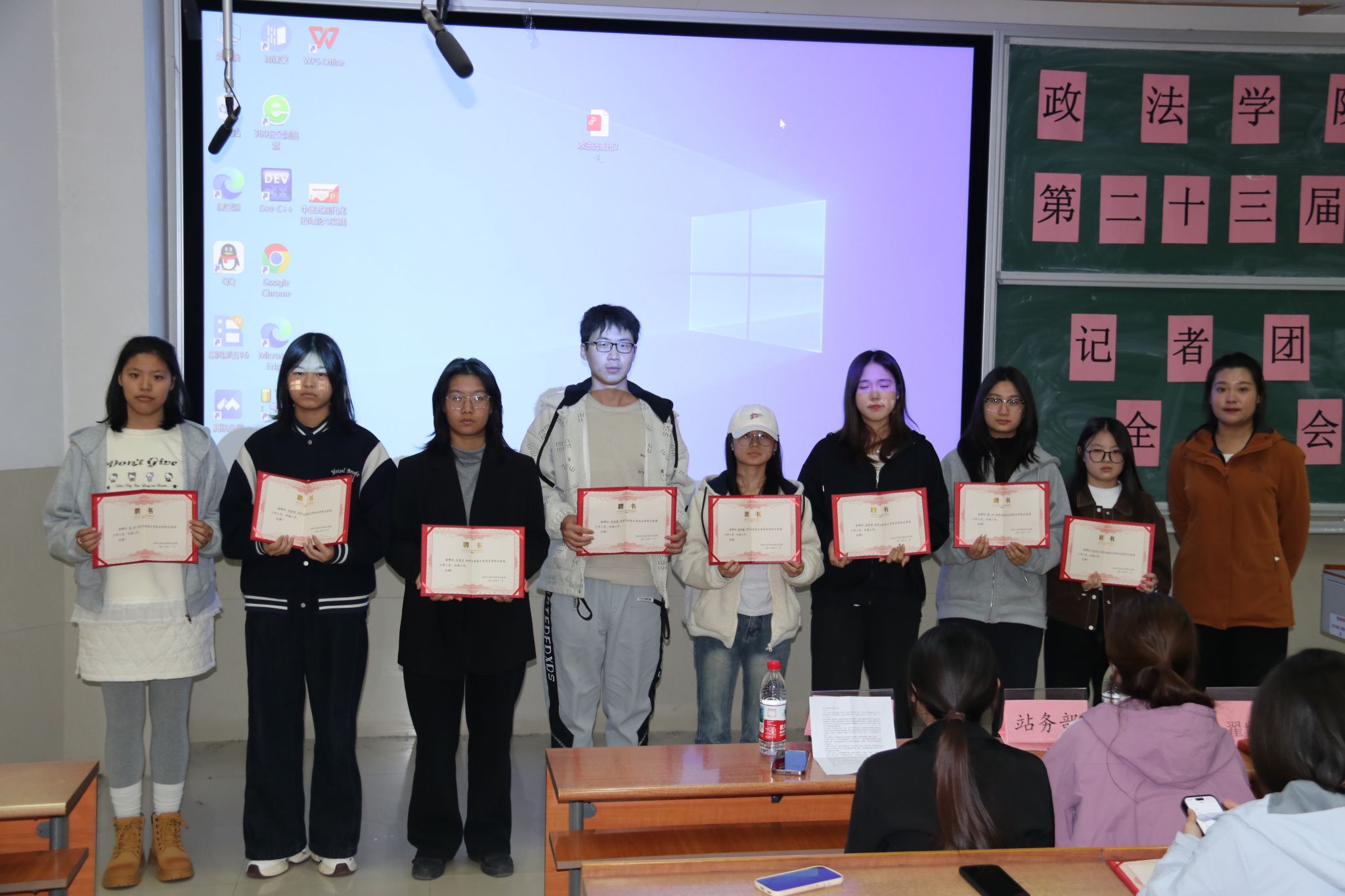 接下来,会议举行新成员聘书颁发仪式。翟世龙老师为新加入的同学逐一授予聘书,沉甸甸的聘书既是对新成员的认可,更是对他们未来履职的期许。新成员们手持聘书,神情坚定,纷纷表示将以严谨认真的态度投入工作,为团队发展贡献青春力量。随后,记者团主席郭琪发表热情洋溢的讲话。她结合自己从干事到主席的成长经历,分享了“感恩、坚守、同行”三个关键词,详细介绍了本学期的重点工作安排,呼吁全体成员凝心聚力、携手共进,让记者团的声音传得更广、更远。此后,部长代表王禹涵、干事代表王佳怡依次发言,分享了在新闻采写、活动组织中的经验心得,表达了深耕校园宣传、助力记者团高质量发展的坚定决心。