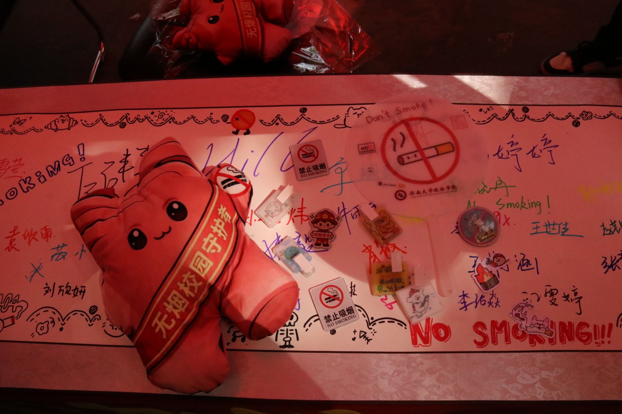 活动现场设置多元互动环节,兼具知识性与趣味性。“我为无烟校园代言”签名卷轴前,师生踊跃签名寄语,作出远离烟草、守护健康的郑重承诺;控烟法规拼图、无烟与消防安全知识问答等环节,让大家在轻松互动中认清烟草危害,了解吸烟带来的宿舍安全隐患与消防风险,破除认知误区。参与者完成任务即可集章打卡、参与抽奖,丰富奖品进一步提升了现场参与热情。
