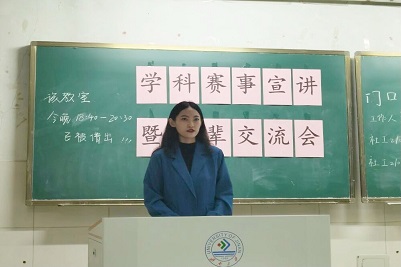 会议第一环节为学科赛事宣讲。法学1803班王铭萱就法学专业的模拟法庭作经验分享,社工1801班陈瑶瑶针对社工专业的“青山杯” 社会工作大赛作详细介绍,社保2002班吴智怡就公共管理专业的公共案例大赛作介绍,思政1902班孟涵针对思想政治教育专业(师范类)的师范生从业技能大赛结合自身参赛经验作详细介绍。