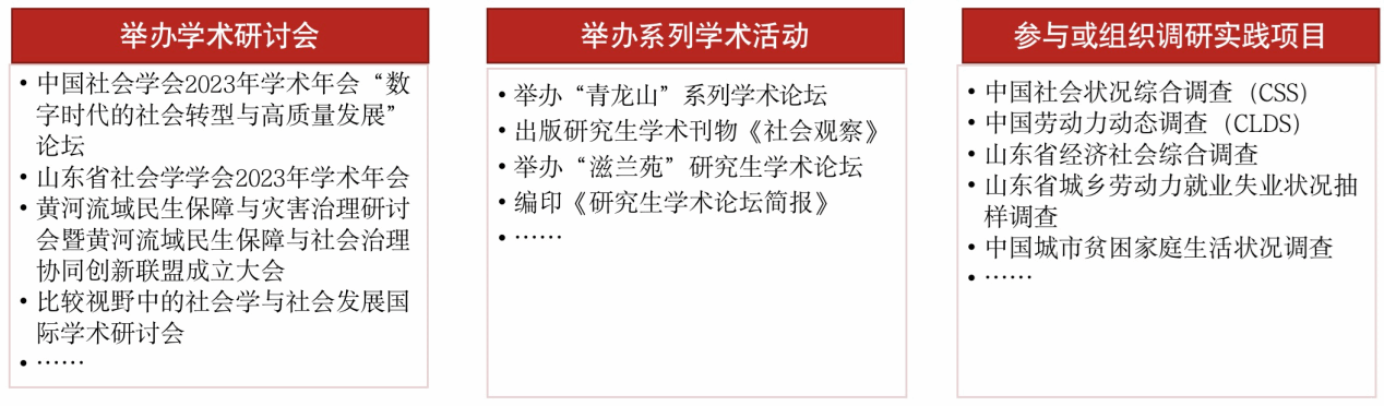 连续举办“滋兰苑”社会学研究生学术论坛并编印《研究生学术论坛简报》,定期出版研究生学术刊物《社会观察》;组织承办一系列大规模、高水平、专业性社会调查研究项目,为研究生提供丰富多彩的专业性社会调查实践机会。