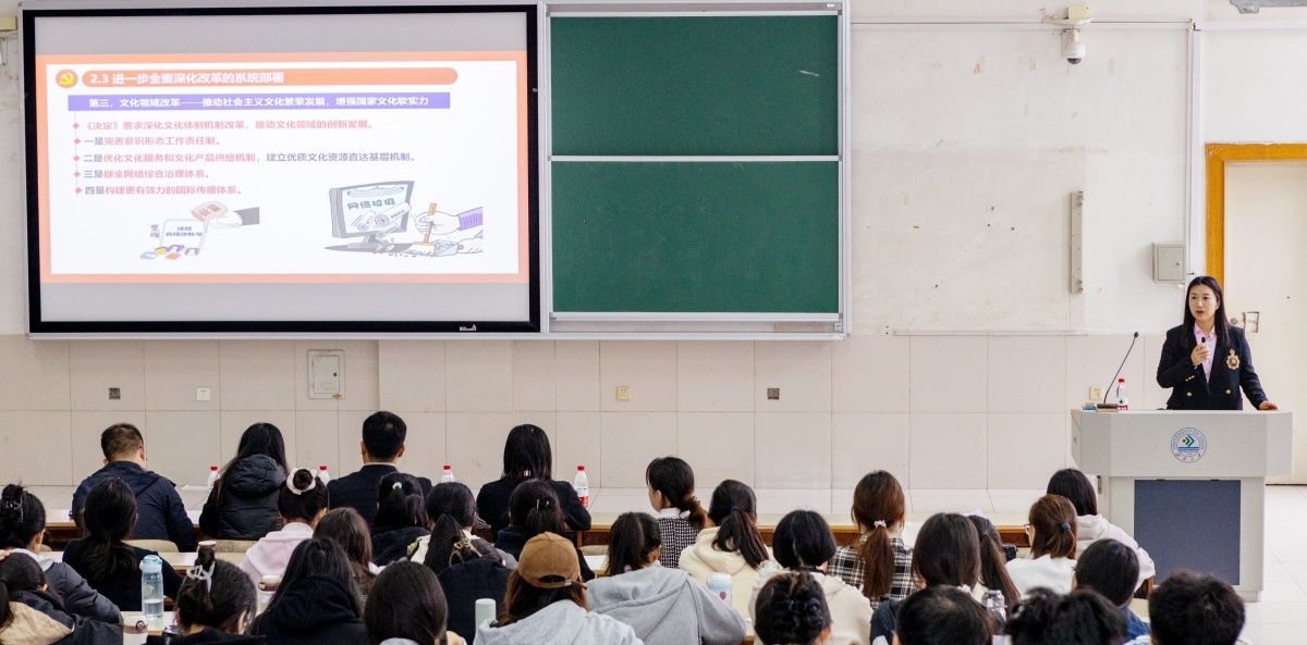 党委书记李春慧在2教201教室以“深入学习贯彻落实党的二十届三中全会精神,为全面推进中华民族伟大复兴贡献力量”为题为学院师生作宣讲报告。