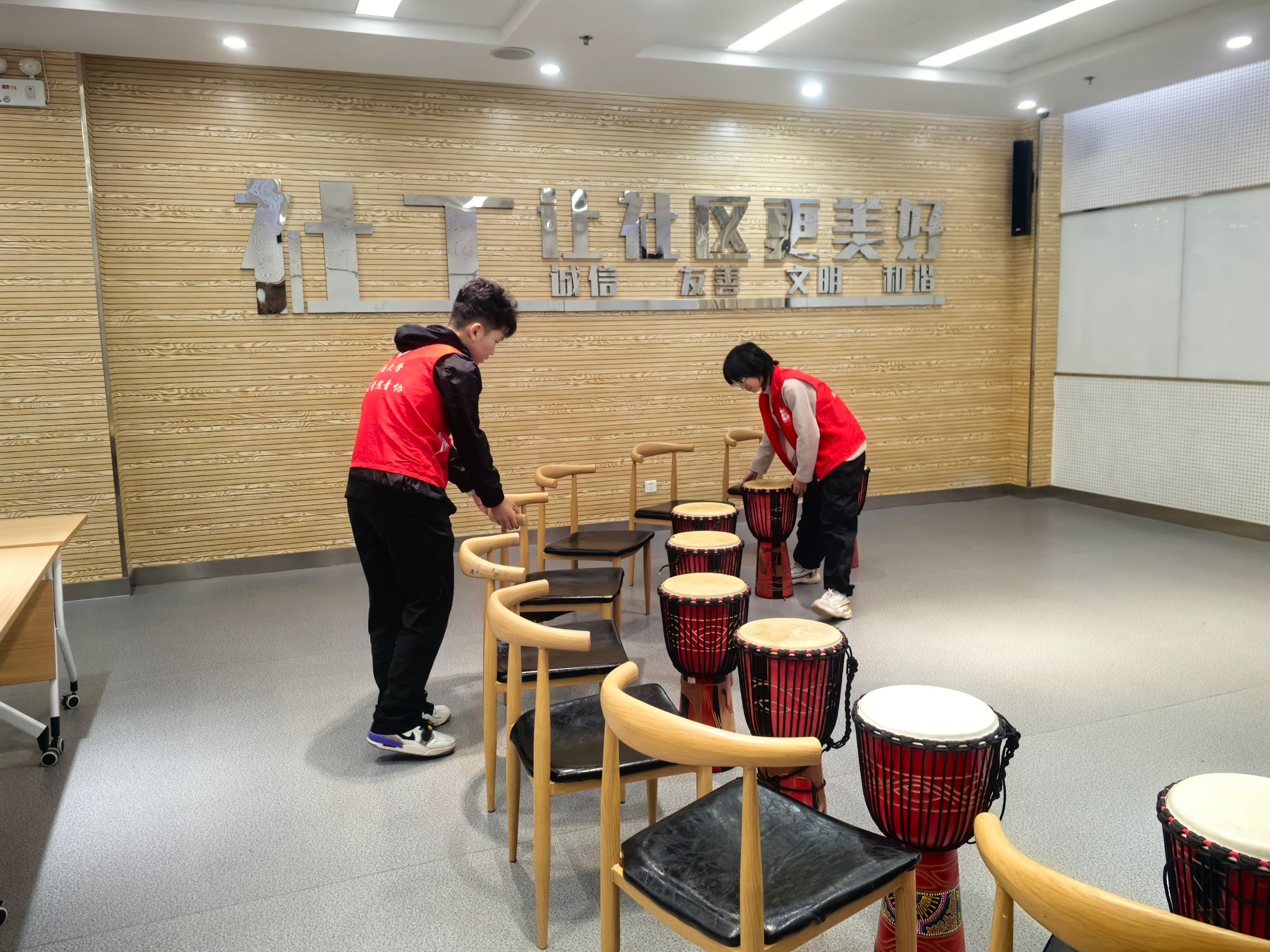 活动当天,志愿者们提前摆好板凳和非洲鼓,为活动顺利启航做好保障。活动中,专业老师率先登场,激情四溢的非洲鼓表演如磁石般牢牢吸引了大家的注意,激起了大家的兴趣,同学们全神贯注,沉浸其中。随后,志愿者们一对一或多对一协助课程同学进行学习。面对手部力量较弱的同学,志愿者耐心地辅助他们击打节奏;面对理解稍慢的同学,志愿者用简单易懂的方式为其讲解韵律。在志愿者的贴心陪伴下,伴着欢快的鼓声,大家渐入佳境,逐渐掌握了非洲鼓的基本节奏,共同完成了简单曲目的演奏。课程后期,同学们进入分组练习环节,志愿者们化身小组间的桥梁,积极促进不同小组间交流、分享经验,喜悦与和谐的氛围充满了整个课堂。