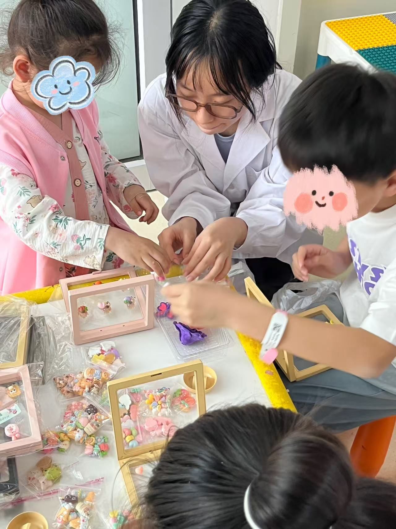 实习生充分发挥专业特长,协助五位住院患儿及其家属开展手工创作。活动现场,实习生们耐心引导患儿们用相框、黏土、小饰品等材料制作感恩礼物。孩子们在轻松愉快的氛围中,创作出一件件充满童趣的创意作品。