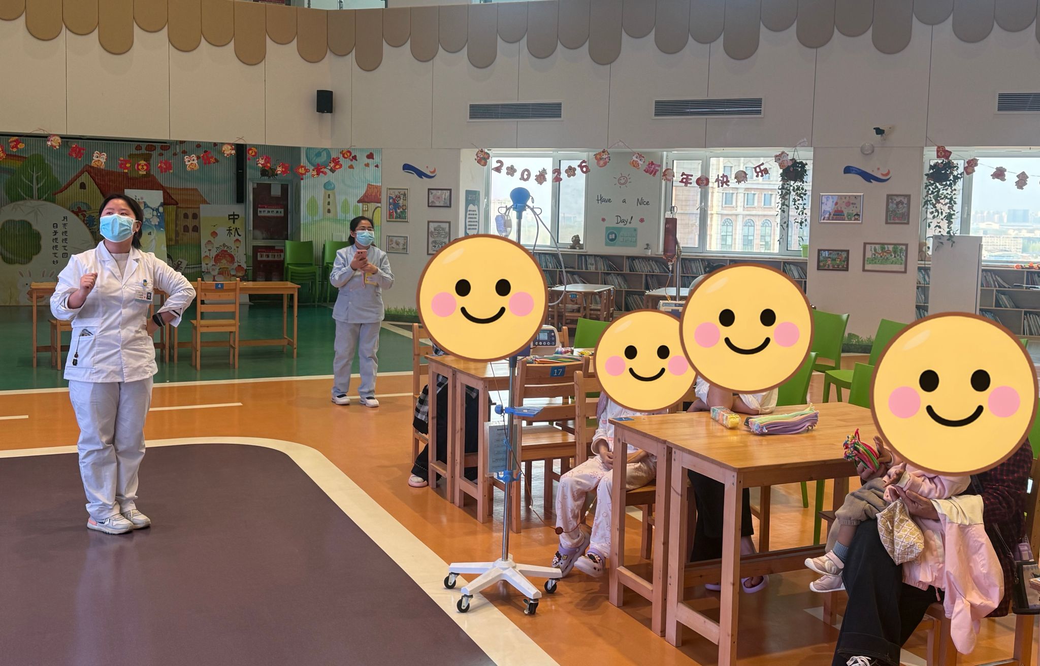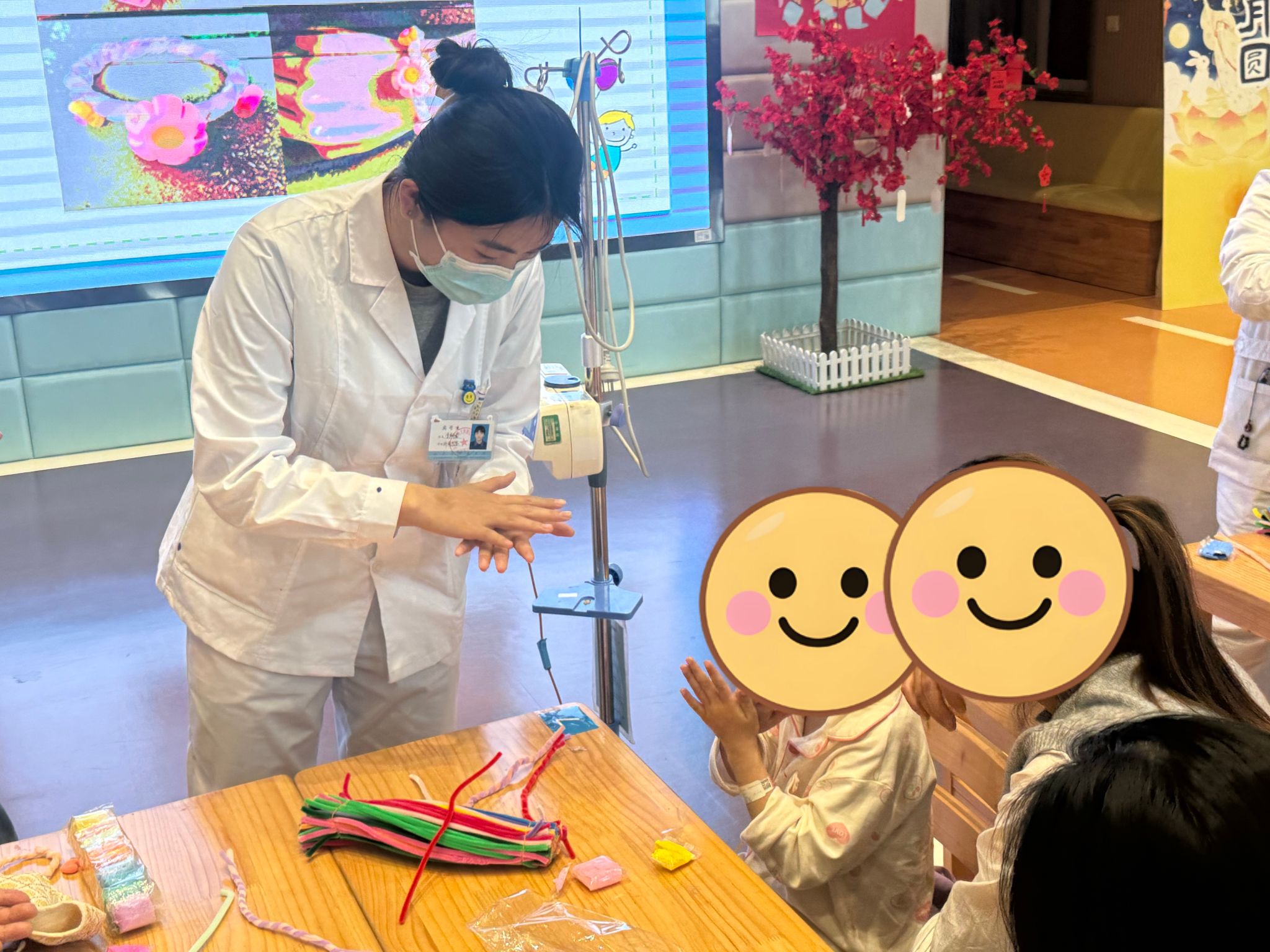 活动尾声,患儿们戴着自己制作的春日手环与医护人员一同合照留念,用镜头定格这份美好与温暖,为此次活动画上圆满句号。