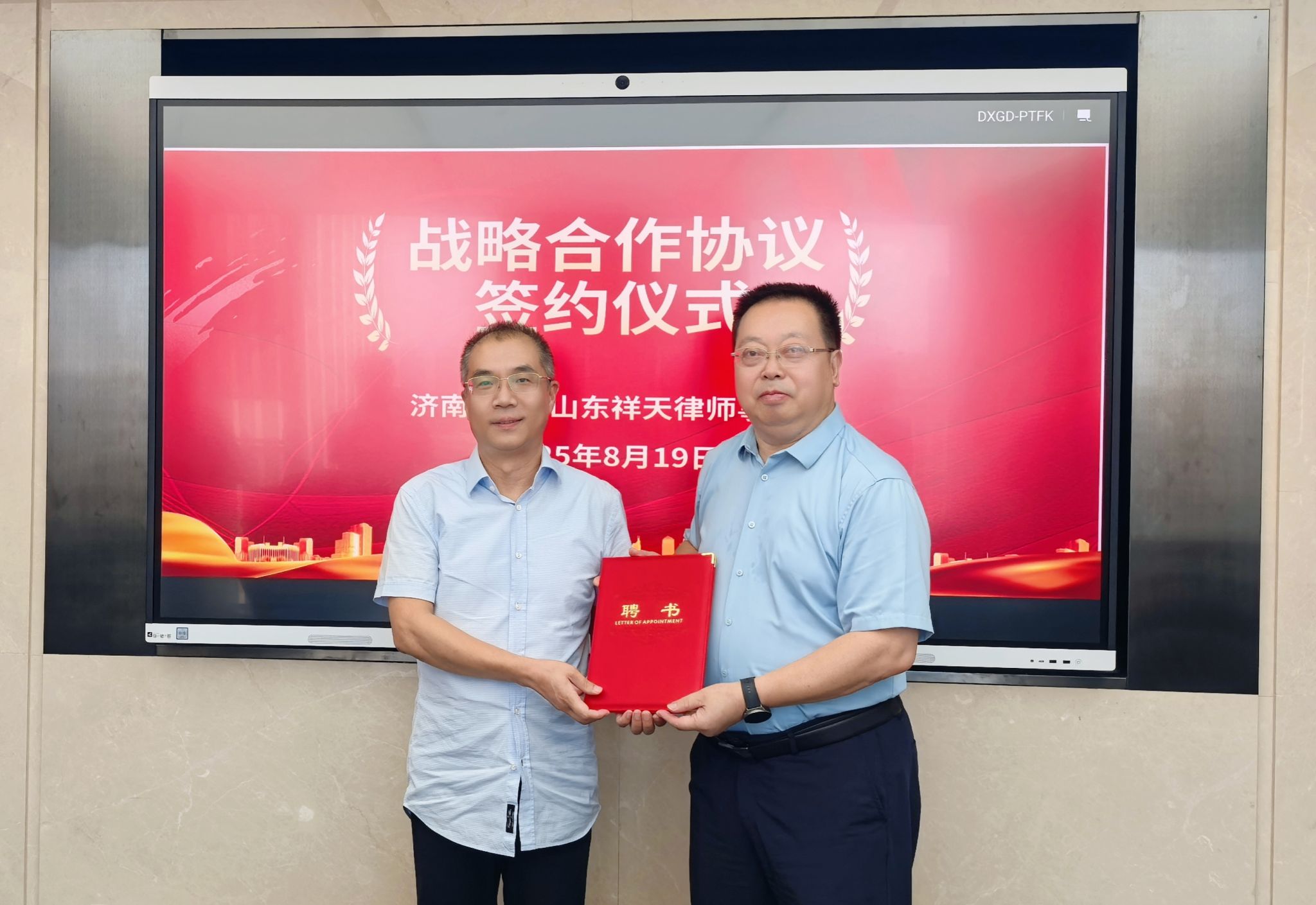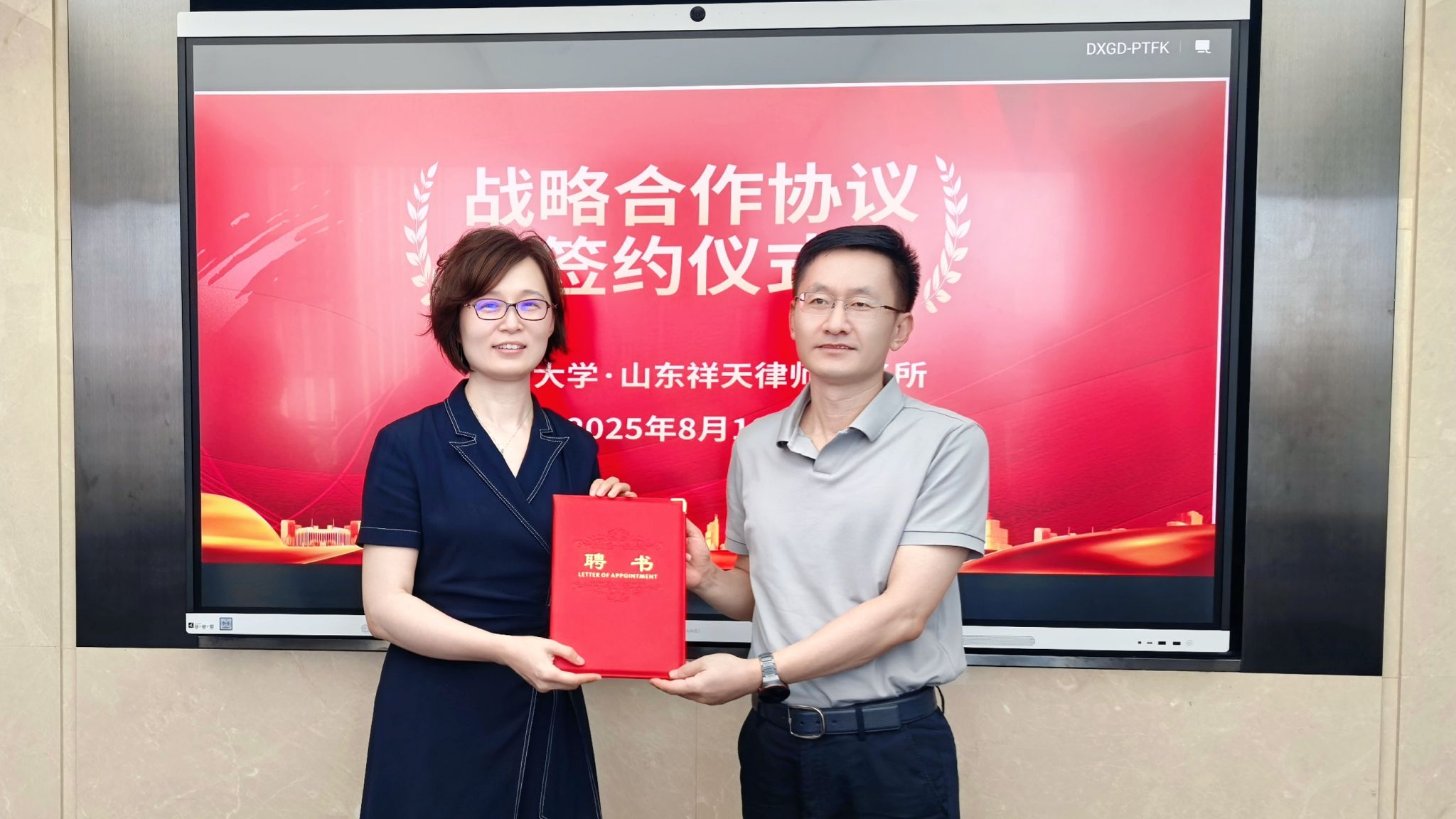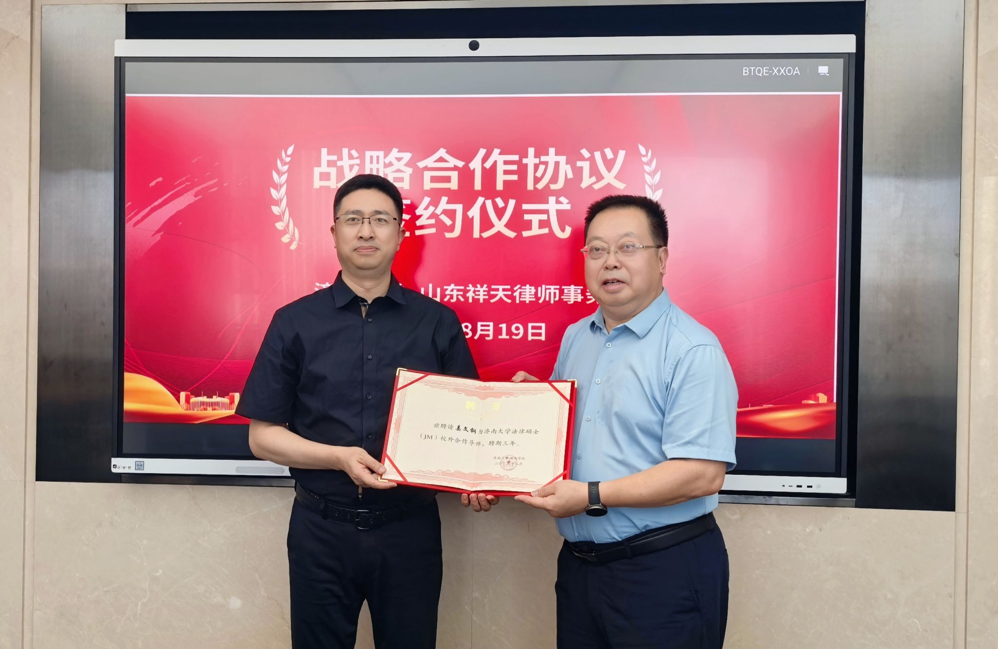 与山东祥天律师事务所举行战略合作协议签约仪式。学校党委副书记、校长刘宗明,党委常委、副校长、党委组织部部长滕晋,山东祥天律师事务所主任姜文钢出席活动。山东祥天律师事务所党支部书记孙茂信、业务主任高希臣、行政主任蔡文娜、监事会主任孙光虎、管委会主任韩帅,学校社科处处长、绅士漫画