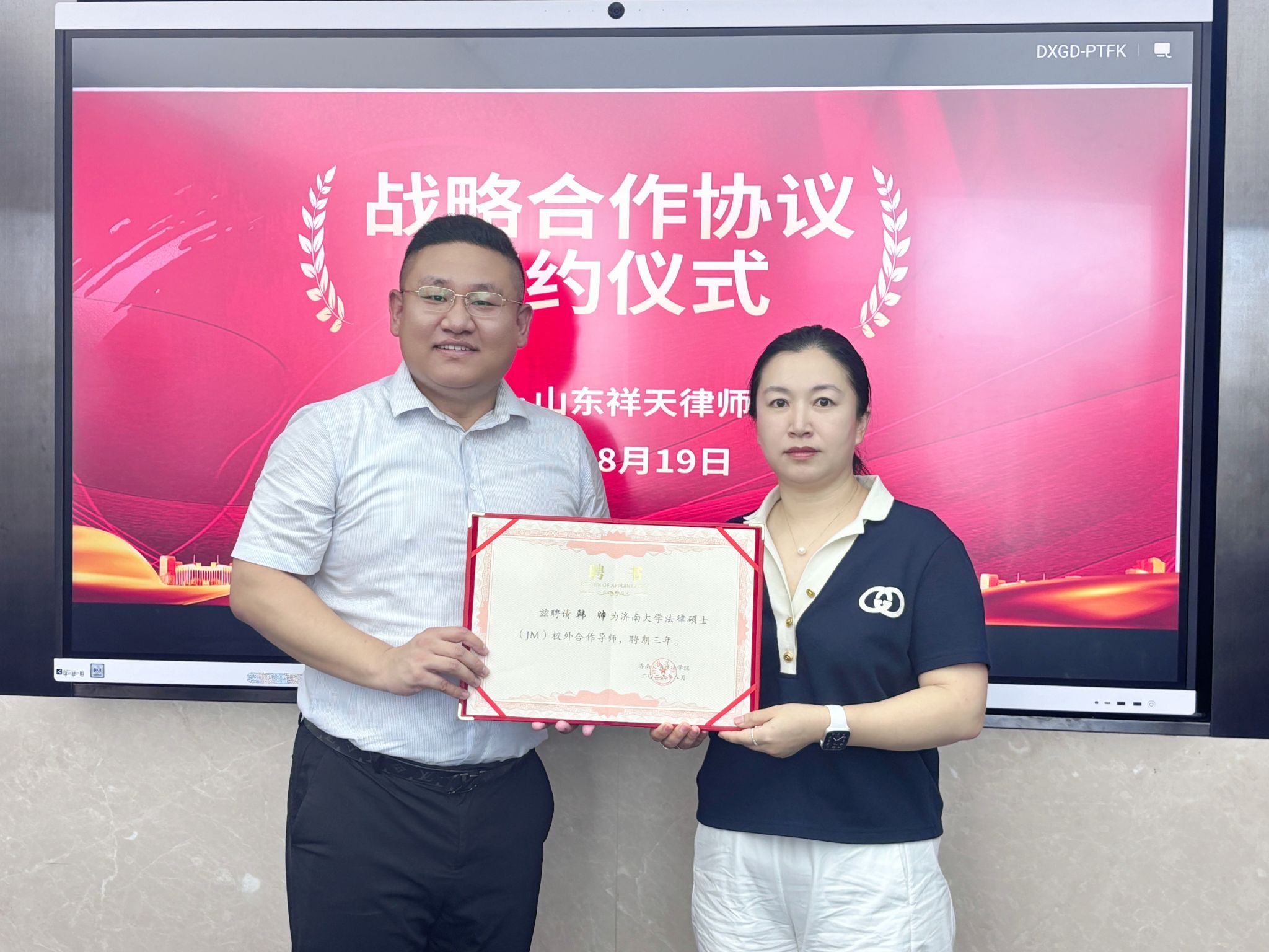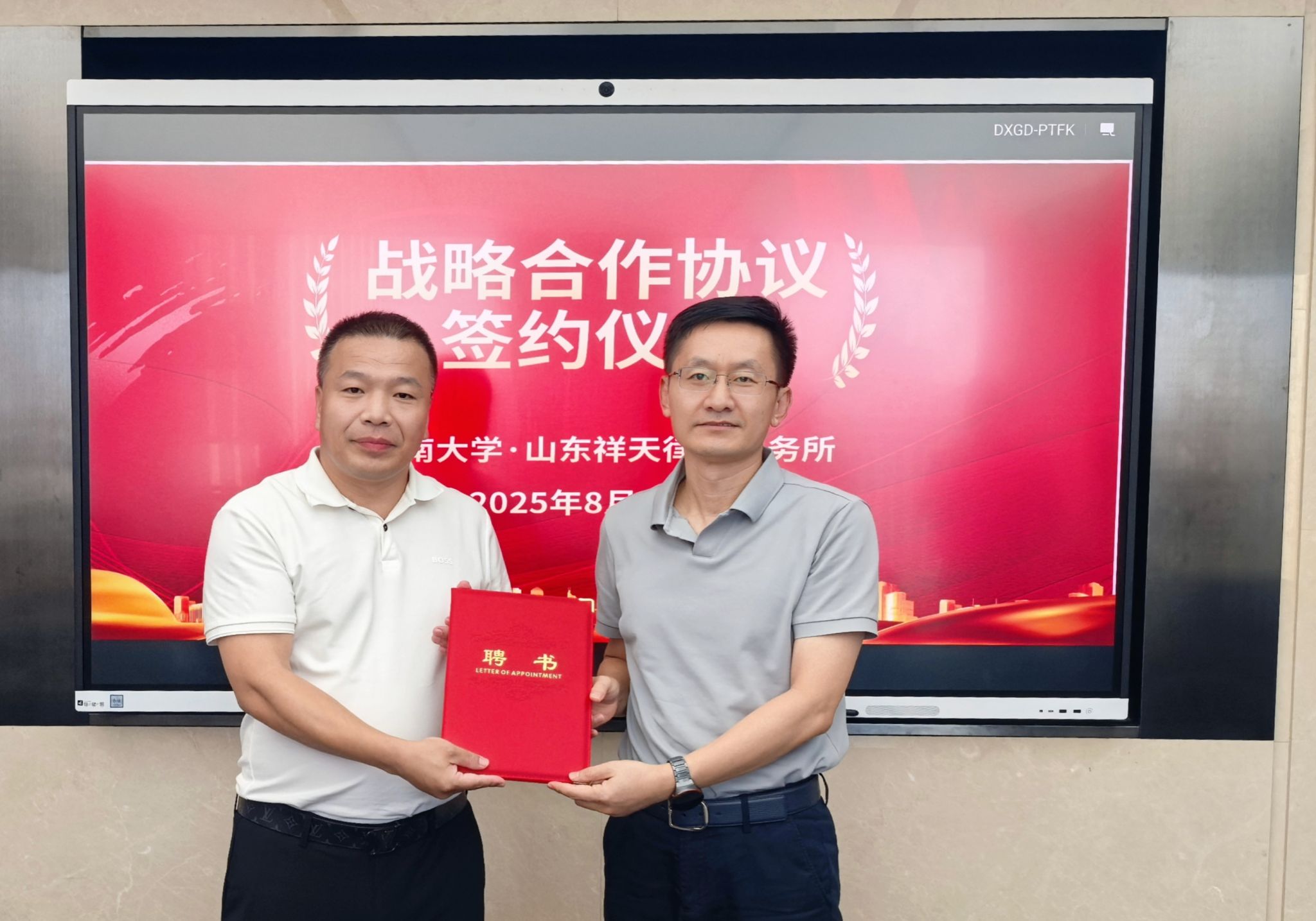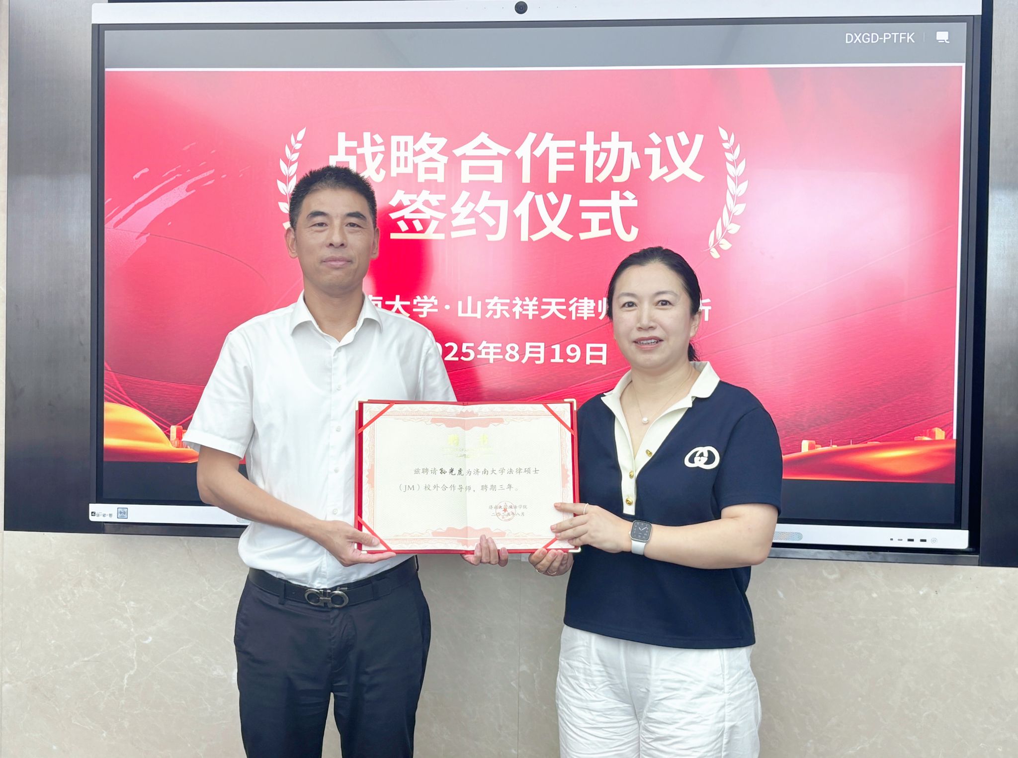 与山东祥天律师事务所举行战略合作协议签约仪式。学校党委副书记、校长刘宗明,党委常委、副校长、党委组织部部长滕晋,山东祥天律师事务所主任姜文钢出席活动。山东祥天律师事务所党支部书记孙茂信、业务主任高希臣、行政主任蔡文娜、监事会主任孙光虎、管委会主任韩帅,学校社科处处长、绅士漫画