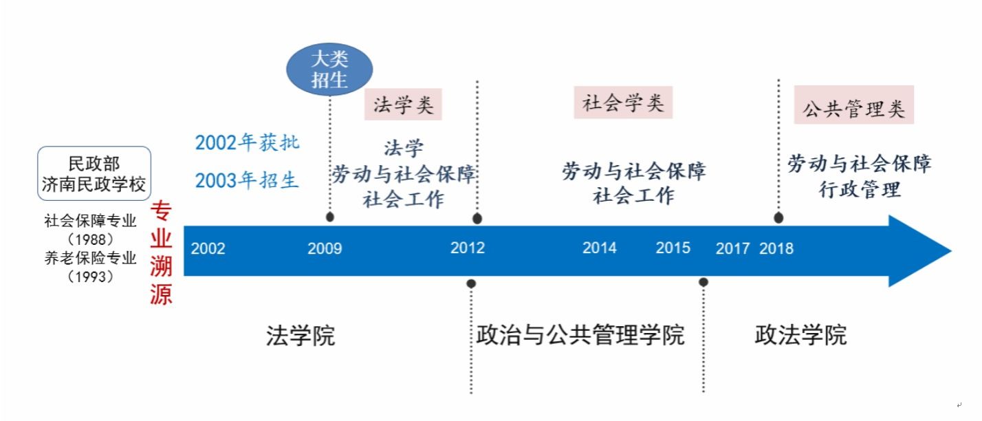 劳动与社会保障专业历史悠久,底蕴深厚。1988年原民政部济南民政学校在全国率先开设社会保障专业,2002年经教育部批准设立劳动与社会保障本科专业,为全国较早开展社会保障领域教学研究的院校之一。2017年获批省高水平应用型建设专业(群),2024年软科中国大学专业排名B类专业。本专业属于典型的文理兼收、多学科交叉融合专业(社会学、管理学、经济学、计算机科学与技术等),为学院新文科建设重点改革示范专业。